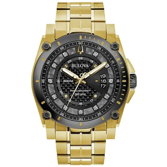 Präsentation der Bulova® Analogue 'Precisionist' Herrenarmbanduhr 98D156, ein bemerkenswertes Zeitmessgerät, das Raffinesse und Technologie verkörpert. Diese Uhr fällt mit ihrem auffälligen goldfarbenen Edelstahlgehäuse und dem eleganten schwarzen Zifferblatt auf, das einen perfekten Kontrast bietet. Mit einem Durchmesser von 45 mm ist sie für Männer gestaltet, die einen mutigen Style schätzen und dabei einen raffinierten Touch haben möchten. Das Ziffernblatt ist mit einem Mineralglas geschützt, das Kratzer verhindert und sicherstellt, dass Ihre Uhr in jedem Abenteuer makellos bleibt. Erleben Sie Präzision wie nie zuvor mit dem Quarzwerk, das dieses beeindruckende Stück antreibt. Ein zusätzliches Merkmal ist der Diamant, der einen Hauch von Luxus hinzufügt, indem er Haltbarkeit und Eleganz perfekt verbindet. Die Uhr enthält auch einen Datumsanzeiger direkt unter der 12-Uhr-Markierung, der geschickt in das Design integriert ist. Sie werden von dem Sicherheits-Faltschließe begeistert sein, die eine zusätzliche Sicherheitsebene bietet und gleichzeitig Komfort am Handgelenk gewährleistet. Mit einer Wasserdichtigkeitsbewertung von 30 Bar ist diese Uhr perfekt für jeden Anlass, von lässigen Ausflügen bis hin zu formellen Anlässen. Das goldfarbene Edelstahlband ergänzt das Gehäuse wunderschön und hat eine Breite von 23 mm, was einen perfekten Sitz gewährleistet. Dies ist nicht nur eine Uhr; sie ist ein Statussymbol, das sowohl Stil als auch Funktionalität präsentiert, entworfen für den modernen Mann.Shop Bulova® Analogue 'Precisionist' Herrenarmbanduhr 98D156 bei Ormoda