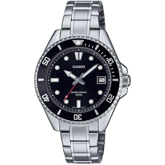 Ein elegantes Zusammenspiel von Stil und Funktionalität präsentiert die Casio® Analogue 'Casio Collection' Unisex-Uhr MDV-10D-1A1VEF. Diese Taucheruhr vereint einen raffinierten Gehäuse aus silbernem Edelstahl und ein Armband, das mit einer Gehäusedurchmesser von 36 mm und einer Dicke von nur 10 mm aufwarten kann. Das elegante schwarze Zifferblatt wird durch ein Mineralglas geschützt, das sowohl Klarheit als auch Langlebigkeit gewährleistet. Mit einem Datumsfenster und einer Lünette, die mit Ziffern versehen ist, wurde dieser Zeitmesser sorgfältig für praktischen Einsatz und mühelose Handhabung gestaltet. Angetrieben von einem zuverlässigen Quarzwerk verspricht diese Uhr Präzision. Zudem zeigt sie ein poliertes Finish, das typisch für Casio ist. Das Armband, das eine Länge von 20 cm und eine Breite von 15 mm aufweist, besitzt einen Klappverschluss mit Druckknopf, wodurch ein fester Sitz am Handgelenk gewährleistet ist. Darüber hinaus bietet die Uhr eine Wasserbeständigkeit von bis zu 5 bar, sodass sie ideal für Wassersportarten wie Schwimmen oder Schnorcheln geeignet ist. Egal, ob auf dem Weg zur Arbeit oder bei einem Wochenendausflug - die Casio Collection sorgt dafür, dass Sie stets pünktlich und stilvoll bleiben. Ihr Unisex-Design macht sie zu einem vielseitigen Accessoire, das für jeden geeignet ist. Gleichzeitig sorgt das Gewicht von nur 84 g für einen hohen Tragekomfort im Laufe des Tages. Heben Sie Ihr Accessoire-Game mit diesem außergewöhnlichen Zeitmesser von Casio hervor.Shop Casio® Analogue 'Casio Collection' Unisex-Uhr bei Ormoda
