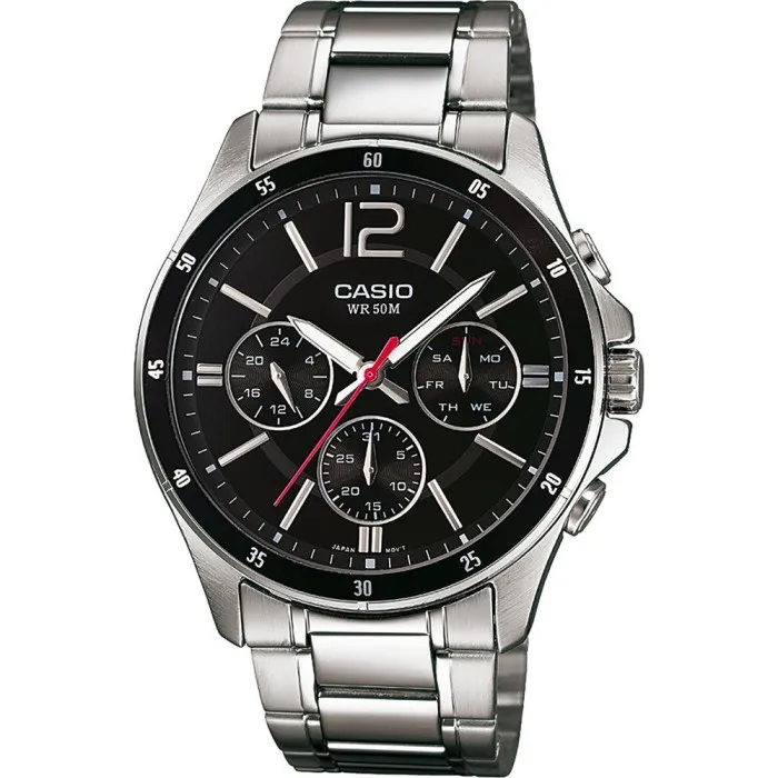 Casio® Multi Dial 'Casio Collection' Herren Uhr MTP-1374PD-1AVEF ist ein beeindruckendes Beispiel für das Handwerk, für das die Marke Casio bekannt ist. Diese Uhr vereint Funktionalität und Ästhetik und verkörpert Vielseitigkeit, wodurch sie das ideale Accessoire für den modernen Mann darstellt. Das runde Gehäuse aus Messing mit einer silbernen Oberfläche und einem Durchmesser von 43mm sorgt für ein robustes, aber dennoch elegantes Profil. Das schwarze Zifferblatt wird durch die Multi-Dial-Funktionalität ergänzt und stellt sicher, dass Sie immer pünktlich sind, egal wohin das Leben Sie führt. Die kontrastierenden Farben bieten eine auffällige Optik, die unter durablem Mineralglas geschützt ist und die Uhr vor Kratzern und täglichem Verschleiß bewahrt. Diese Uhr ist nicht nur schick; sie verfügt über einen Tag-Datum-Kalender, der Ihnen hilft, organisiert und im Zeitplan zu bleiben. Das Edelstahlarmband mit einer Länge von 21 cm und einer Breite von 21 mm erhöht die Haltbarkeit und den Tragekomfort, während die faltbare Schließe mit Druckknopf einfaches An- und Ablegen ermöglicht. Mit einer Dicke von nur 11 mm bietet sie ein schlankes Design, das bequem am Handgelenk sitzt und sowohl für informelle als auch für formelle Anlässe geeignet ist. Die Uhr ist bis 5 ATM wasserdicht, was eine weitere Zuverlässigkeit für den aktiven Mann hinzufügt. Ob bei der Arbeit, im Fitnessstudio oder beim Ausgehen, die Casio Multi Dial sorgt dafür, dass Sie den perfekten Begleiter am Handgelenk haben.Shop Casio® Multi Dial 'Casio Collection' Herren Uhr bei Ormoda