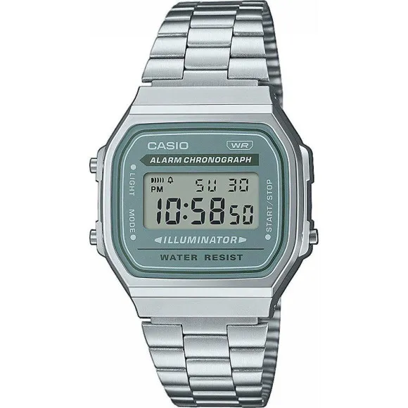 Präsentieren Sie die Casio Digital 'Casio Collection Vintage' Unisex-Uhr A168WA-3AYES, ein klassisches Zeitmessgerät, das Einfachheit und Eleganz in einem modernen, lässigen Stil verkörpert. Diese Uhr besteht aus einem strapazierfähigen Gehäuse aus Resin, das 35 mm in Länge und 35 mm in Breite misst und ein schlankes, rechteckiges Design zeigt, das Funktionalität und Ästhetik perfekt vereint. Angetrieben von einem zuverlässigen Quarzwerk sorgt sie für präzise Zeitmessung für Männer und Frauen. Entworfen für den täglichen Gebrauch, hebt das atemberaubende grüne Zifferblatt ihre visuelle Anziehungskraft hervor, während das Mineralglasfenster vor Kratzern und Beschädigungen schützt. Das Armband besteht aus Edelstahl in einem komplementären silbernen Farbton und bietet sowohl Komfort als auch Haltbarkeit. Mit einer Armlänge von 20 cm und einer Breite von 20 mm passt es bequem ums Handgelenk. Die Faltschließe sorgt für einen sicheren Sitz und macht es leicht, die Uhr den ganzen Tag über zu tragen. Funktionalität wird nicht vernachlässigt, mit Funktionen wie dem Tagesdatum-Kalender, der Ihnen hilft, problemlos organisiert zu bleiben. Diese Uhr ist zudem bis zu 3 bar wasserdicht und somit für alltägliche Aktivitäten geeignet, ohne dass Sie sich Sorgen machen müssen. Ob Sie sich für ein lässiges Treffen schick machen oder einfach eine zuverlässige Alltagsuhr suchen, die Casio Digital 'Casio Collection Vintage' ist eine vielseitige Ergänzung für jede Garderobe. Es ist nicht nur ein Zeitmesser; es ist ein Ausdruck des Stils, der Ihre Individualität und Ihren Geschmack unterstreicht. Shop Casio® Digital 'Casio Collection Vintage' Unisex-Uhr A168WA-3AYES bei Ormoda