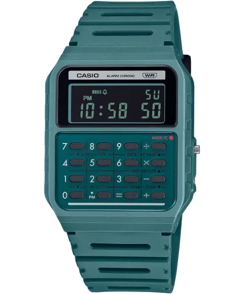 Die Casio® Digital 'Casio Collection Vintage' Herren Uhr CA-53WB-3BEF ist ein auffälliges Zeugnis für die Verschmelzung von Funktionalität und modernem Stil, speziell für den modernen Mann entworfen, der Klarheit im Design und Zweck schätzt. Dieses bemerkenswerte Stück zeigt ein rechteckiges Gehäuse aus Kunststoff, das robustheit und Leichtigkeit perfekt ausbalanciert. Die Uhr ist nicht nur ein Zeitmesser, sondern ein multifunktionaler Begleiter mit einem Quarzwerk für Präzision, Dualzeit-Einstellungen, einem Taschenrechner, einer Stoppuhr und Alarmfunktionen. Mit einem lebendigen grünen Gehäuse und Zifferblatt sticht diese Uhr hervor und verkörpert den abenteuerlichen Geist, während sie ein Niveau an Professionalität beibehält, das sie für verschiedene Anlässe geeignet macht, von legeren Ausflügen bis zu Geschäftstreffen. Das Mineralglas-Zifferblatt sorgt zusätzlich für Haltbarkeit und schützt die Uhr vor den täglichen Aktivitäten. Das bequeme Armband aus Kunststoff, ebenfalls in Grün, hat eine Länge von 21 cm und eine Breite von 20 mm, und bietet eine anpassungsfähige Passform, die sich der Höhe von 43 mm des Gehäuses anpasst. Mit einer Dicke von nur 8 mm hat sie ein schlankes Profil am Handgelenk, ohne den Komfort zu beeinträchtigen. Ausgestattet mit einem Tages-Datum-Kalender und einer Wasserbeständigkeit von 3 Bar ist diese Uhr bestens für die Überraschungen des Lebens gerüstet. Ob Sie ein Ereignis zeitlich festlegen oder einfach nur das Datum überprüfen, das digitale Display verbessert die Sichtbarkeit und macht diese Uhr zu einem zuverlässigen Werkzeug für den täglichen Gebrauch. Die Casio Collection Vintage steht nicht nur für das Zeitmanagement; sie ist eine Verkörperung des modernen, intelligenten Lebensstils und somit die perfekte Ergänzung für jede Männervorliebe.Shop Casio® Digital 'Casio Collection Vintage' Herren Uhr bei Ormoda