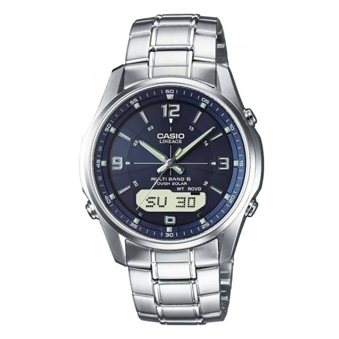Die Casio® Analoguhr-Digitaluhr 'Collection' für Männer LCW-M100DSE-2AER ist ein Beweis für die perfekte Kombination aus Stil und Funktionalität. Dieses bemerkenswerte Zeitmesser verfügt über ein auffällig blaues Zifferblatt, elegant umschlossen in einem runden Edelstahlgehäuse mit einer verfeinerten silbernen Oberfläche. Mit einem Durchmesser von 40 mm und nur 9 mm Dicke bietet diese Uhr ein schlankes Profil, das für jeden Anlass geeignet ist, sei es lässig oder formell. Das robuste Saphirglas schützt das Zifferblatt vor Kratzern und sorgt dafür, dass Ihre Uhr ihre funkelnde Klarheit behält. Ein herausragendes Merkmal dieses Zeitmessers ist seine innovative solarbetriebene Bewegung. Indem sie die Kraft des Lichts nutzt, beseitigt diese Uhr die Mühe mit Batteriewechseln und bietet Ihnen einen ständigen Begleiter, der sowohl zuverlässig als auch nachhaltig ist. Ihre fortschrittliche funkferngesteuerte Funktionalität sorgt dafür, dass Sie immer pünktlich sind, indem sie sich automatisch an Ihre Zeitzone mit beeindruckender Genauigkeit anpasst. Die Uhr umfasst auch Weltzeit-, Stoppuhr- und Timer-Fähigkeiten, was sie zum idealen Begleiter für den modernen Mann macht, der Präzision und Bequemlichkeit schätzt. Das silberne Edelstahlarmband ist mit einer Länge von 21 cm und einer Breite von 18 mm sowohl robust als auch stilvoll und mit einer Klappe ausgestattet, die den Komfort und die Anpassungsfähigkeit erhöht. Mit einer ATM-Bewertung von 5 bar ist dieses Meisterwerk nicht nur stilvoll, sondern auch praktisch für den täglichen Gebrauch. Egal, ob Sie zu einem Geschäftstreffen unterwegs sind oder ein Wochenende genießen, die Casio® Analoguhr-Digitaluhr 'Collection' wird nahtlos in jeden Lebensstil passen. Die Tages- und Datumsanzeige fügt eine zusätzliche Funktionalität hinzu, die eine einfache Nachverfolgung Ihres Zeitplans ermöglicht. Diese Uhr ist eine ideale Wahl für Männer, die Eleganz mit Innovation zu schätzen wissen. Shop Casio® Analoguhr-Digitaluhr 'Collection' für Männer LCW-M100DSE-2AER bei Ormoda