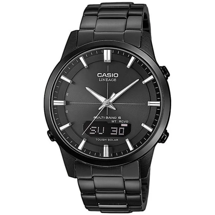 Präsentation der Casio® Analogue-digital 'Collection' Herrenarmbanduhr LCW-M170DB-1AER, eine perfekte Verbindung von Raffinesse und Funktionalität. Dieses bemerkenswerte Zeitstück ist für den modernen Mann konzipiert, der Präzision und Stil schätzt. Die Uhr zeigt ein elegantes schwarzes Gehäuse aus hochwertigem Edelstahl, das Haltbarkeit und einen Hauch von Luxus bietet. Mit einem Durchmesser von 40 mm passt sie bequem an jedes Handgelenk und setzt dabei ein kühnens Statement. Das runde Design wird durch ein auffälliges schwarzes Zifferblatt ergänzt, das sowohl analoge als auch digitale Anzeigen bietet, um Klarheit und Benutzerfreundlichkeit zu gewährleisten. Es verwendet Saphirglas, das für seine Kratzfestigkeit bekannt ist, und bietet zusätzlichen Schutz für das Zifferblatt, während es ein verfeinertes Aussehen bewahrt.\n\nDie Uhr wird von einem Quarzwerk angetrieben, das zuverlässiges Zeitmanagement garantiert. Mit einem Fokus auf Praktikabilität bietet sie Merkmale wie einen Tages- und Datumsanzeiger, Solarstromfähigkeiten, Weltzeitverfolgung, einen Stoppuhr, einen Countdown-Timer und einen Alarm. Mit einer Wasserbeständigkeit von bis zu 5 Bar ist dieses Zeitmessgerät für den täglichen Gebrauch geeignet und bewältigt auch Ihre abenteuerlichsten Aktivitäten. Das Armband, hergestellt aus Edelstahl, hat ein elegantes schwarzes Finish und misst 21 cm in der Länge und 18 mm in der Breite, und sorgt somit für einen bequemen Sitz mit einer Faltverschlusstechnik, die mit einem Druckknopf ausgestattet ist. Ob bei einer formellen Gelegenheit oder während eines lässigen Ausflugs, die Casio® Analogue-digital 'Collection' Herrenarmbanduhr vereint Stil und Funktion, was sie zu einem unverzichtbaren Accessoire für jede Garderobe macht. Shop Casio® Analogue-digital 'Collection' Herrenarmbanduhr LCW-M170DB-1AER bei Ormoda