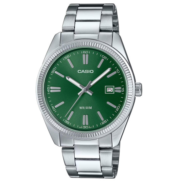 Präsentation der Casio® Analogue 'Collection' Herren Uhr MTP-1302PD-3AVEF, eine perfekte Kombination aus Stil und Funktionalität, die den modernen Mann anspricht. Entworfen für einen lässigen, aber anspruchsvollen Lebensstil, zeichnet sich diese Uhr durch präzise Handwerkskunst aus. Das runde Gehäuse aus Messing besticht mit einem eleganten Silberton, der das lebendige grüne Zifferblatt hervorhebt und einen auffälligen Kontrast bietet, der ins Auge fällt. Mit einem Gehäusedurchmesser von 38 mm und einer Dicke von nur 9 mm sitzt sie bequem am Handgelenk und ist somit der ideale Begleiter für den Alltag und besondere Anlässe. Diese Zeitmesser funktioniert mit einem zuverlässigen Quarzwerk, das eine präzise Zeitanzeige gewährleistet, während das Mineralglasfenster einen klaren Blick auf das Zifferblatt bietet. Die Uhr verfügt zudem über eine Datumsanzeige, die nahtlos in das Design integriert ist und deren Praktikabilität erhöht. Das Armband aus Edelstahl, das eine Länge von 21 cm und eine Breite von 18 mm misst, ist nicht nur langlebig, sondern trägt auch zur Gesamtästhetik bei und verleiht einen polierten Look. Die MTP-1302PD-3AVEF ist so konzipiert, dass sie den Herausforderungen des täglichen Lebens standhält und bietet eine Wasserdichtigkeit von bis zu 5 bar, sodass sie in verschiedenen Bedingungen bedenkenlos getragen werden kann. Ob Sie sich für ein Meeting schick anziehen oder ein entspanntes Wochenende genießen, diese Uhr verkörpert Vielseitigkeit und ist ein unverzichtbares Accessoire für den anspruchsvollen Herren. Mit einem Gewicht von nur 104 Gramm ist sie leicht, aber dennoch robust, wodurch Komfort und Tragbarkeit den ganzen Tag gewährleistet sind.Shop Casio® Analogue 'Collection' Herren Uhr MTP-1302PD-3AVEF bei Ormoda
