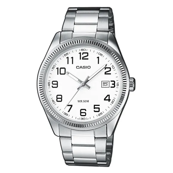 Die Casio® Analoge 'Collection' Unisex-Uhr MTP-1302PD-7BVEF ist ein unverzichtbares Accessoire, das Stil und Funktionalität perfekt miteinander verbindet. Diese Uhr verkörpert die Essenz der lässigen Eleganz und macht sie für verschiedene Anlässe geeignet, sei es ein Arbeitstag oder eine entspannte Wochenendverabredung. Das runde Gehäuse aus Messing, das einen Durchmesser von 39 mm und eine Dicke von 9 mm hat, wird durch ein auffälliges weißes Zifferblatt ergänzt, das eine klassische analoge Anzeige und einen praktischen Datumsanzeiger bietet. Ein robustes Mineralglas schützt das Zifferblatt, garantiert klare Sichtbarkeit und Langlebigkeit. Die Uhr ist mit einem präzisen Quarzwerk ausgestattet, bekannt für seine Zuverlässigkeit, sodass Sie keinen Augenblick verpassen. Das silberne Edelstahlband, das eine Länge von 21 cm und eine Breite von 18 mm hat, vereint Strapazierfähigkeit mit Eleganz und verfügt über einen sicheren Faltverschluss. Mit einer Wasserdichtigkeit von bis zu 5 bar kann diese Uhr Spritzwasser und kurzzeitigen Wasserkontakt problemlos standhalten, was ihre Praktikabilität erhöht. Mit nur 105 Gramm Gewicht bietet sie ein angenehmes Tragegefühl für sowohl Männer als auch Frauen, was sie zu einer vielseitigen Ergänzung für jede Garderobe macht. Erleben Sie die perfekte Kombination aus Qualität und Stil mit diesem außergewöhnlichen Zeitmesser. Shop Casio® Analoge 'Collection' Unisex-Uhr MTP-1302PD-7BVEF bei Ormoda