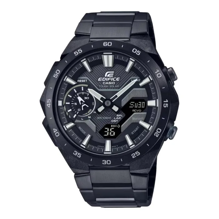 Wir präsentieren die Casio® Analogue-digital 'Edifice' Herren Uhr ECB-2200DC-1AEF, eine harmonische Verbindung von Eleganz und Sportlichkeit, entworfen für den modernen Mann. Dieses Zeitmesser-Symbol bietet nicht nur ein robustes Design, sondern integriert auch fortschrittliche Technologien, um Funktionalität mit Stil zu verbinden. Mit ihrem stilvollen schwarzen Gehäuse und Zifferblatt strahlt die Uhr ein Gefühl von Selbstbewusstsein aus, während sie gleichzeitig praktisch bleibt. Die Konstruktion aus Edelstahl sorgt für Langlebigkeit und macht sie perfekt für den Alltag sowie für besondere Anlässe. Der Quarzmechanismus garantiert Präzision, sodass Sie immer pünktlich sind, egal wohin das Leben Sie führt. Die innovative Ausstattung dieser Uhr unterstützt die Bluetooth-Konnektivität und ermöglicht so eine mühelose Synchronisation mit Ihrem Smartphone. Die Solar-Technologie versorgt die Uhr mit Lichtenergie und erhöht ihre Nachhaltigkeit sowie Zuverlässigkeit. Das analoge-digitale Display bietet einen modernen Look und erleichtert das Ablesen von Zeit und Datum. Zusätzliche Funktionen wie Stoppuhr, Weltzeit und Countdown machen sie zu einem unverzichtbaren Begleiter für Ihre Abenteuer. Ob im Fitnessstudio oder bei einem geschäftlichen Treffen, diese Uhr ergänzt nahtlos Ihren Lebensstil. Die Wasserbeständigkeit von bis zu 10 bar sorgt für Seelenruhe, wenn Sie Aktivitäten wie Schwimmen oder Laufen im Regen nachgehen. Die Casio Edifice ist ein Statement, nicht nur eine Uhr. Mit einem Durchmesser von 44 mm und einer Dicke von 12 mm sitzt sie bequem am Handgelenk und ist somit der ideale Begleiter für den anspruchsvollen Gentleman. Das schwarze Edelstahlarmband mit einer Länge von 21 cm und einer Breite von 24 mm verfügt über eine Sicherheits-Faltschließe mit Druckknopf, was Sicherheit und einfache Handhabung garantiert. Dieses Zeitmesser-Exemplar ist für das Tempo Ihres Lebens konstruiert und bewahrt gleichzeitig ein elegantes Erscheinungsbild. Genießen Sie Eleganz und Funktionalität mit der Casio® Analogue-digital 'Edifice' Herren Uhr ECB-2200DC-1AEF.Shop Casio® Analogue-digital 'Edifice' Herren Uhr ECB-2200DC-1AEF bei Ormoda