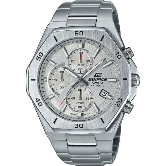 Die Casio® Chronograph 'Edifice' Herren Uhr EFB-680D-7AVUEF ist ein Zeugnis für Präzision und Stil, entworfen speziell für den modernen Mann, der sowohl Funktionalität als auch ästhetische Anziehungskraft schätzt. Diese Uhr verfügt über ein elegantes Gehäuse aus silbernem Edelstahl mit einem Durchmesser von 42 mm und einer Dicke von 10 mm, was sie zu einer perfekten Wahl für jedes Handgelenk macht. Ihr rundes Design wird durch ein glänzendes silbernes Zifferblatt ergänzt, das mit einem gehärteten Saphirglasfenster versehen ist, was Langlebigkeit und Kratzfestigkeit gewährleistet. Dieses Zeitmesser wird von einem zuverlässigen Quarzwerk betrieben, das eine genaue Zeitmessung sicherstellt. Der Chronographen-Anzeigetyp ermöglicht präzise Zeitmessungen, sodass sie für verschiedene Aktivitäten, von sportlichen bis zu professionellen Veranstaltungen, geeignet ist. Mit einer beeindruckenden Wasserdichtigkeitsbewertung von 10 Bar kann diese Uhr Spritzern und kurzfristigem Eintauchen in Wasser standhalten, was garantiert, dass sie mit Ihrem aktiven Lebensstil Schritt hält. Die Uhr verfügt über eine praktische Datumsanzeige, die ihre Funktionalität erhöht, während die Lünette mit Ziffern ihr elegantes Design verstärkt. Das Armband aus Edelstahl, 21 cm lang und 24 mm breit, trägt nicht nur zur Gesamtschönheit der Uhr bei, sondern bietet auch Komfort. Es ist mit einer Faltglieder-Schließe ausgestattet, die zusätzlich einen Druckknopf für mehr Bequemlichkeit beinhaltet. Für Männer, die sowohl Nützlichkeit als auch Raffinesse schätzen, ist die Casio® Chronograph 'Edifice' das ultimative Accessoire. Ob bei einem wichtigen Geschäftstermin oder beim entspannten Ausgehen, dieses Zeitmesser ergänzt mühelos jeden Look. Setzen Sie ein Statement mit einer Uhr, die Handwerkskunst und modernes Design verkörpert. Shop Casio® Chronograph 'Edifice' Herren Uhr EFB-680D-7AVUEF bei Ormoda