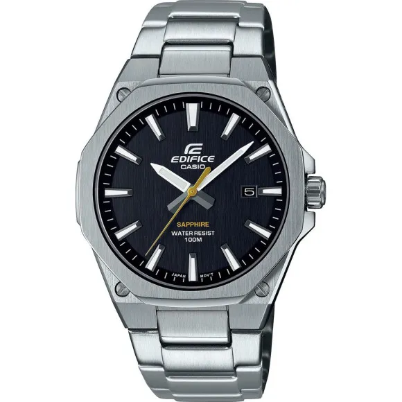 Erleben Sie zeitlose Eleganz mit der Casio Analoge 'Edifice' Herrenuhr. Dieses Modell EFR-S108D-1AVUEF vereint auf wunderbare Weise Funktionalität und Stil. Die Uhr verfügt über ein robustes Gehäuse aus Edelstahl mit einer verfeinerten silbernen Oberfläche, die Klasse und Haltbarkeit ausstrahlt. Mit einem Durchmesser von 37 mm und einer Dicke von nur 8 mm bietet sie ein schlankes Profil, das sowohl für legere Ausflüge als auch für professionelle Anlässe ideal ist. Das auffällige schwarze Zifferblatt wird von Saphirglas geschützt, was außergewöhnliche Klarheit und Kratzfestigkeit garantiert. Ausgestattet mit einem Quarzwerk können Sie sich auf eine genaue Zeitmessung verlassen, ergänzt durch eine praktische Datumsfunktion für zusätzlichen Komfort. Das silberne Edelstahlarmband verbessert nicht nur die allgemeine Ästhetik, sondern garantiert durch seine Länge von 21 cm und Breite von 21 mm auch Tragekomfort. Die Faltschließe mit Druckknopf sorgt dafür, dass die Uhr sicher und passgenau an Ihrem Handgelenk sitzt. Mit einer ATM-Bewertung von 10 Bar ist dieses Zeitmessgerät dafür konzipiert, Spritzwasser standzuhalten und sich an verschiedenen Anlässen elegant zu präsentieren, was es zu einem idealen Begleiter für Ihre täglichen Abenteuer macht. Egal, ob Sie im Büro sind oder Ihre Freizeit genießen, die Casio Analoge 'Edifice' Herrenuhr bringt sowohl Eleganz als auch Praktikabilität an Ihr Handgelenk und hebt Ihren Sinn für Stil mit jedem Blick hervor.