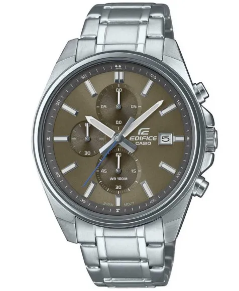 Die Casio® Chronograph 'Edifice' Herrenuhr EFV-610D-5CVUEF verkörpert die perfekte Mischung aus Eleganz und sportlicher Leistungsfähigkeit. Diese auffällige Uhr verfügt über ein robustes, 42 mm großes Gehäuse aus Edelstahl, das in einem glänzenden Silberton gehalten ist und Aufmerksamkeit erregt, ohne übertrieben zu wirken. Das glatte Mineralglas schützt das reichhaltige braune Zifferblatt und zeigt die detaillierte Chronographenfunktionalität, die für den modernen Mann entworfen wurde, der Präzision und Stil schätzt. Mit einer Dicke von nur 11 mm behält diese Uhr ein schlankes Profil bei und bietet gleichzeitig eine bedeutende Präsenz am Handgelenk. Das Edelstahlarmband, das 21 cm lang und 20 mm breit ist, sorgt für Langlebigkeit und Komfort. Die Faltschließe mit Druckknopf bietet Sicherheit und einfache Handhabung, was sie ideal für aktive Lebensstile macht. Mit einer Datumsanzeige und einer Wasserdichtigkeit von bis zu 10 Metern ist diese Uhr so praktisch wie modisch. Ob auf dem Spielfeld oder in einer Vorstandssitzung, die Edifice Uhr lässt nie die Gelegenheit aus, Ihren Look zu heben. Mit einem Gewicht von nur 128 Gramm ist sie angenehm für den Ganztagsgebrauch. Wenn Sie nach einem Zeitmesser suchen, der Raffinesse verkörpert und gleichzeitig mit Ihrem dynamischen Lebensstil Schritt hält, ist die Edifice eine ausgezeichnete Wahl. Shop Casio® Chronograph 'Edifice' Herrenuhr bei Ormoda