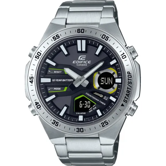 Die Casio® Analogue-digital 'Edifice' Herrenuhr EFV-C110D-1A3VEF ist eine perfekte Fusion aus Funktionalität und Stil. Entworfen für den modernen Mann fängt dieses Zeitstück die Essenz der Sportlichkeit mit seinen robusten Eigenschaften und schlankem Design ein. Die Uhr zeigt ein markantes rundes Gehäuse mit einem Durchmesser von 46 mm und einer Dicke von 13 mm aus langlebigem Edelstahl. Zifferblatt in auffälligem Schwarz, geschützt durch Mineralglas, sorgt für Klarheit, während es sich für verschiedene Anlässe eignet, ob im Büro oder auf einem Abenteuer. Die Uhr bietet eine analoge-digitale Anzeige, eine ideale Kombination für diejenigen, die die traditionellen und modernen Elemente der Zeitmessung schätzen. Sie können bequem Tag und Datum verfolgen und profitieren von zusätzlichen Funktionen wie Stoppuhr, Countdown-Timer, Alarm und Weltzeit, die den Bedürfnissen eines aktiven Lebensstils gerecht werden. Mit leuchtenden Zeigern können Sie sich auf diese Uhr verlassen, die Sie auch bei schwachem Licht informiert. Umrahmt von einer Lünette mit Zahlen strahlt die Edifice Selbstbewusstsein und Raffinesse aus. Das robuste Band aus silbernem Edelstahl misst 21 cm in der Länge und 24 mm in der Breite und wird durch eine Faltschließe mit einem Druckknopf für einen sicheren Sitz ergänzt. Mit einer Wasserdichtheit von bis zu 10 bar ist dieses Zeitstück bereit für alles, was das Leben Ihnen entgegenwirft. Mit einem komfortablen Gewicht von 166 g ist die Edifice nicht nur funktional, sondern auch das perfekte Accessoire für jeden modernen Gentleman. Shop Casio® Analogue-digital 'Edifice' Herrenuhr bei Ormoda