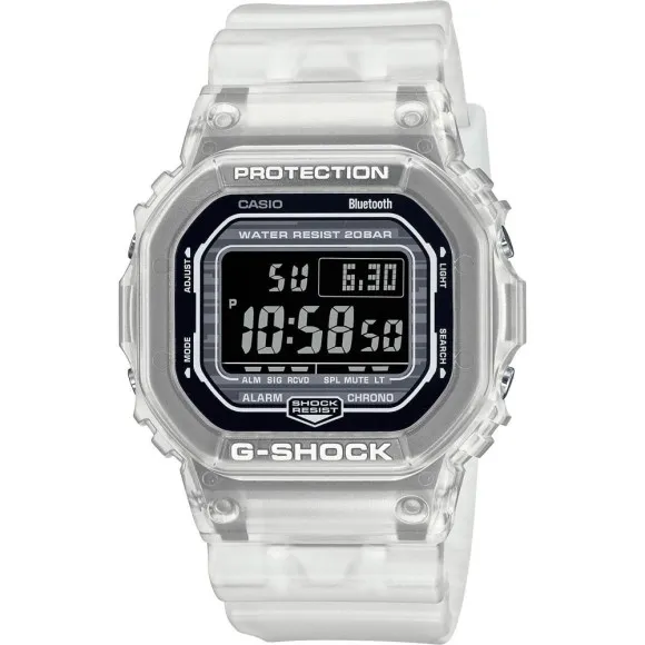 Die Casio Digital 'G-shock' Herren Uhr DW-B5600G-7ER ist das Inbegriff von widerstandsfähigem Zeitmanagement, das exklusiv für den modernen Mann entworfen wurde, der Wert auf Haltbarkeit und Leistung legt. Hergestellt von der angesehenen Marke Casio unter der ikonischen G-Shock-Serie, verkörpert diese Uhr den Geist des Abenteuers. Bekannt für ihre außergewöhnlich robuste Bauweise, ist sie darauf ausgelegt, den Strapazen des täglichen Lebens und aller Outdoor-Aktivitäten standzuhalten. Das hochwertige Resin in ihrem rechteckigen Gehäuse sorgt dafür, dass sie leicht bleibt und gleichzeitig außergewöhnliche Schockresistenz bietet, was sie zum perfekten Begleiter für aktive Sportler und Outdoor-Enthusiasten macht. Diese Uhr präsentiert ein schlankes Design mit einem robusten, transparenten Gehäuse, das 43 mm lang, 34 mm breit und nur 12 mm dick ist. Das schwarze Zifferblatt steht in einem schönen Kontrast zum weißen Kunststoffarmband, das eine Länge von 21 cm aufweist und mit einem sicheren Schnallenverschluss ausgestattet ist. Ob im Fitnessstudio oder im Alltag, das auffällige digitale Display garantiert eine einfache Zeitablesung. Bemerkenswerte Extras umfassen Bluetooth-Konnektivität, eine Stoppuhr, einen Countdown-Timer, eine Weltzeitfunktion und Alarmfunktionen, was sie zu einem vielseitigen Werkzeug für Routine und Abenteuer macht. Mit einer Wasserdichtigkeit von bis zu 20 Bar ausgestattet, kann diese Uhr alle wasserbezogenen Aktivitäten bewältigen, vom Schwimmen bis zu Wassersportarten. Mit einem Gewicht von lediglich 54 Gramm bietet sie maximalen Komfort und vereint auf einzigartige Weise Praktikabilität mit Stil. Die Casio Digital 'G-shock' Herren Uhr DW-B5600G-7ER ist ein zuverlässiges Zeugnis für die robusten Fähigkeiten der G-Shock-Uhren und bietet sowohl Funktionalität als auch Flair für den anspruchsvollen Träger. Shop Casio® Digital 'G-shock' Herren Uhr DW-B5600G-7ER bei Ormoda