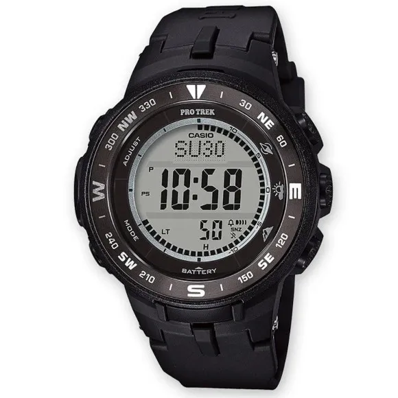 Die Casio® Chronograph 'Pro-trek' Herrenuhr PRG-330-1ER ist ein Beweis für die robusten Eigenschaften, die für Outdoor-Abenteuer notwendig sind. Als Teil der Pro-Trek-Kollektion verkörpert diese Uhr Funktionalität und wurde speziell für die Bedürfnisse ernsthafter Outdoor-Enthusiasten und Profis entwickelt. Ihr militärischer Stil wird durch ein auffälliges schwarzes Gehäuse aus Resin geprägt, das nach bester Ingenieurskunst konzipiert wurde, um die Haltbarkeit zu gewährleisten und gleichzeitig ein leichtes Tragegefühl am Handgelenk zu bieten. Mit einem Durchmesser von 45mm und einer Dicke von nur 12mm sitzt diese Uhr bequem über lange Stunden, egal ob Sie einen Berg besteigen oder durch eine lebhafte Stadt navigieren. Was die Funktionen angeht, so bietet die Casio Pro-trek eine Vielzahl fortschrittlicher Merkmale. Die Uhr wird von einem zuverlässigen Quarzwerk angetrieben, das präzise Zeitmessung gewährleistet, auf die Sie sich verlassen können. Eine beeindruckende Wasserdichtigkeit von bis zu 10 Bar sorgt dafür, dass sie Regen und Spritzwasser standhält, während der solarbetriebene Mechanismus Langlebigkeit und Komfort für regelmäßige Nutzer garantiert. Darüber hinaus ist das Chronographen-Display intuitiv und kombiniert eine präzise Stoppuhr mit einem Tages- und Datumsanzeiger, perfekt, um Ihren hektischen Zeitplan im Auge zu behalten. Die einzigartige Lünette verfügt über eine Kompassfunktion, damit Sie bei Ihren Reisen immer die Orientierung behalten. Das LCD-Zifferblatt, geschützt durch robustes Mineralglas, vereint Klarheit und Haltbarkeit und bietet eine einfache Ablesbarkeit unter verschiedenen Lichtbedingungen. Das stabile Gehäuse wird von einem robusten schwarzen Kunststoffband ergänzt, das eine angenehme Länge von 21cm und eine Breite von 22mm hat und mit einer klassischen Dornschnalle gesichert ist. Mit der Pro-trek am Handgelenk sind Sie bestens gerüstet, um Herausforderungen selbstbewusst und stilvoll anzugehen. Shop Casio® Chronograph 'Pro-trek' Herrenuhr bei Ormoda