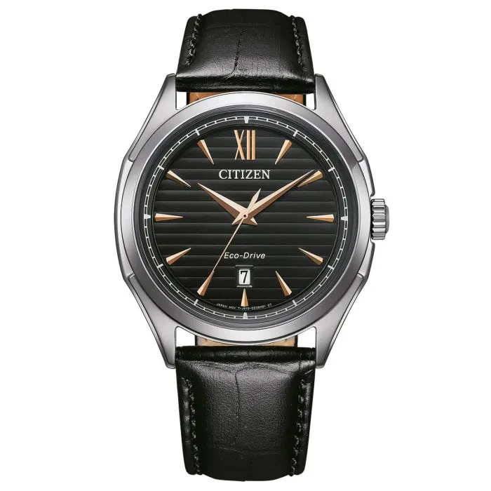 Die Citizen® Analogue Herrenuhr AW1750-18E besticht durch ihre raffinierte Eleganz und robuste Funktionalität. Entworfen mit einer Mischung aus Raffinesse und Praktikabilität, richtet sich dieses Zeitmesser speziell an den modernen Mann, der sowohl Stil als auch Leistung schätzt. Mit einem Eco-Drive-Uhrwerk betrieben, benötigt diese Uhr kein Batteriewechsel, da sie durch Licht betrieben wird. Mit einem eleganten, runden Gehäuse aus langlebigem Edelstahl sorgt das silberne Finish für einen schönen Kontrast zum markanten schwarzen Zifferblatt und macht sie sowohl für Büroanlässe als auch formelle Veranstaltungen geeignet. Das Mineralglasfenster bietet starken Kratzschutz und gewährleistet Klarheit sowie Haltbarkeit, wenn Sie sie am meisten benötigen. Das Gehäuse hat einen Durchmesser von 42 mm und passt bequem am Handgelenk, während das 21 mm breite schwarze Lederband ein Element von Raffinesse hinzufügt. Das Band ist nicht nur für die Ästhetik geeignet, sondern auch für den Komfort mit einer Länge von 21 cm, sodass es sich an verschiedene Handgelenkgrößen anpassen lässt. Mit einer Dicke von nur 10 mm liegt die Uhr unauffällig am Handgelenk und macht sie zu einer vielseitigen Ergänzung Ihrer Sammlung. Die Uhr verfügt über eine Datumsanzeigefunktion, die praktische Details für Ihren Alltag bietet. Wasserdicht bis zu 10 bar ist sie so konstruiert, dass sie verschiedenen Bedingungen standhält und Ihnen Sicherheit bietet, ob im Büro oder beim Wassersport am Wochenende. Setzen Sie ein Statement mit einem Zeitmesser, der sowohl traditionelle Handwerkskunst als auch moderne Technologie verkörpert. Shop Citizen® Analogue Herrenuhr AW1750-18E bei Ormoda