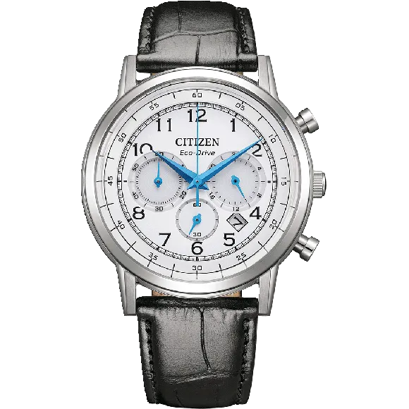 Die Citizen® Chronograph Herrenuhr CA4630-02A ist ein beeindruckendes Zeugnis für das Engagement der Marke für Innovation und Leistung. Diese Armbanduhr vereint Funktionalität und Eleganz und ist der perfekte Begleiter für den modernen Mann. Das Uhrenmodell verfügt über eine Eco-Drive-Technologie, die sicherstellt, dass es durch Licht angetrieben wird, sodass Sie sich keine Gedanken über den Wechsel der Batterie oder das Aufziehen machen müssen. Das runde Gehäuse aus hochwertigem Edelstahl sorgt nicht nur für Langlebigkeit, sondern strahlt auch eine raffinierte Ästhetik aus. Mit einem Durchmesser von 42 mm und einer Dicke von 14 mm sitzt sie angenehm am Handgelenk und hat gleichzeitig eine Präsenz, die Aufmerksamkeit erregt. Das weiße Zifferblatt dient als klares Grundgerüst und bietet Klarheit und eine mühelose Ablesbarkeit. Mit einer Chronographenanzeige zeigt diese Uhr nicht nur die Zeit an; sie ermöglicht auch das präzise Messen von Zeitintervallen, was sie sowohl für den professionellen Einsatz als auch für persönliche Unternehmungen ideal macht. Die kratzfeste Kristallglasoberfläche sorgt dafür, dass das Zifferblatt der Uhr makellos bleibt, während die Datumsfunktion Sie organisiert und pünktlich hält. Das schwarze Lederarmband mit einer Länge von 21 cm und einer Breite von 21 mm vereint sowohl Komfort als auch Stil und lässt sich perfekt an Ihr Handgelenk anpassen dank einer sicheren Dornschließe. Zudem ist die Uhr bis zu 5 Bars wasserdicht, was Ihnen für den täglichen Gebrauch ein sicheres Gefühl gibt. Mit durchdachtem Handwerk und einem zuverlässigen Design ist die Citizen Chronograph Herrenuhr mehr als nur ein Accessoire; sie ist ein essentielles Werkzeug für den ehrgeizigen Individualisten. Ob im Vorstandsbüro oder bei einer Wochenendveranstaltung, diese Uhr wertet Ihr Outfit mühelos auf.Shop Citizen® Chronograph Herrenuhr CA4630-02A bei Ormoda