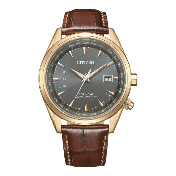 Die Citizen® Analogue Herrenuhr bringt Eleganz in jede Gelegenheit und verkörpert sowohl Leistung als auch Stil. Ihr Eco-Drive-Antrieb nutzt die Kraft des Lichts, sodass Sie nie wieder an den Batteriewechsel denken müssen. Das atemberaubende Gehäuse aus goldfarbenem Edelstahl bietet einen luxuriösen Rahmen für das runde Zifferblatt mit einem Durchmesser von 42 mm, das in einem tiefen Grauton erstrahlt und Selbstbewusstsein und Stil ausstrahlt. Das Saphirglas garantiert Langlebigkeit und schützt diese exquisite Uhr selbst bei täglichem Tragen. Eine Faltschließe sichert das braune Lederarmband, das Komfort und Stil vereint, während die Länge von 21 cm für eine perfekte Passform an Ihrem Handgelenk sorgt. Die Uhr verfügt über leuchtende Zeiger für eine einfache Lesbarkeit bei schwachem Licht und ist mit einer Datumsanzeigerfunktion ausgestattet, was sie sowohl stilvoll als auch praktisch macht. Mit einer Wasserdichtigkeit von bis zu 10 bar ist dieses Stück bereit für jedes Abenteuer. Lassen Sie sich von der Weltzeitfunktion mühelos leiten, ob im Büro oder auf einer internationalen Reise. Die Citizen® Analogue Herrenuhr ist ein unverzichtbarer Begleiter.
