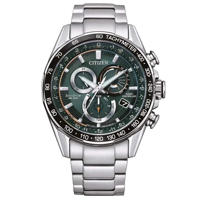 Entdecken Sie die Citizen® Chronograph Herrenuhr CB5914-89X, eine exquisite Verbindung von Funktionalität und Stil, die den modernen Gentleman anspricht. Dieses Zeitmesser verkörpert nicht nur Präzision mit seinem fortschrittlichen Eco-Drive-Antrieb, sondern präsentiert auch ein auffälliges grünes Zifferblatt, das einen Hauch von Persönlichkeit und Raffinesse verleiht. Die Uhr ist sorgfältig aus robustem Edelstahl gefertigt und hat einen Durchmesser von beeindruckenden 43 mm und eine Dicke von 13 mm, was Langlebigkeit garantiert, während sie gleichzeitig einen eleganten Look bewahrt, der sowohl für geschäftliche als auch für lässige Anlässe geeignet ist. Ausgestattet mit einer Tachymeter-Lünette erfüllt diese Uhr sowohl ästhetische als auch praktische Funktionen, indem Sie bequem Geschwindigkeiten während Ihrer Reisen oder Abenteuer messen können. Das Saphirglas-Zifferblatt bietet nicht nur außergewöhnliche Klarheit, sondern auch eine robuste Kratzfestigkeit, sodass Ihre Uhr selbst bei täglichem Tragen makellos bleibt. Das sorgfältig gestaltete Armband aus silbernem Edelstahl ergänzt die Uhr perfekt, mit einer Länge von 21 cm und einer Breite von 21 mm, das sich bequem um Ihr Handgelenk legt. Die Klappschließe mit Druckknopf garantiert einen sicheren Sitz und eine einfache Anpassung, wodurch sie für jeden Anlass benutzerfreundlich ist. Als Modell der Innovation verfügt dieser Chronograph über Solarenergie, sodass Sie sich keine Sorgen um den Batteriewechsel machen müssen. Darüber hinaus ist er funkgesteuert und bietet präzise Zeitmessung, egal wo auf der Welt Sie sich befinden. Die integrierten Stoppuhr- und Alarmfunktionen erhöhen die Vielseitigkeit, was diese Uhr perfekt für den dynamischen Lebensstil des heutigen Mannes macht. Mit einer Wasserbeständigkeit von bis zu 20 Bar wurde die Citizen® Chronograph Herrenuhr entwickelt, um Sie durch jedes Abenteuer zu begleiten, sowohl an Land als auch im Wasser. Shop Citizen® Chronograph Herrenuhr CB5914-89X bei Ormoda