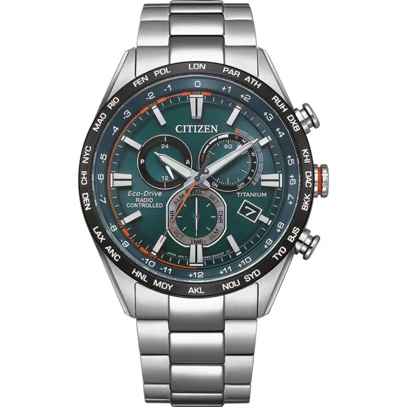 Die Citizen® Chronograph Herrenuhr CB5946-82X ist ein greifbares Symbol für Präzision und Eleganz, das speziell für moderne Männer entworfen wurde, die sowohl Stil als auch Funktionalität schätzen. Diese Uhr ist eine bemerkenswerte Mischung aus fortschrittlicher Technologie und klassischer Ästhetik und eignet sich für zahlreiche Anlässe, sei es ein Geschäftstreffen oder ein lässiger Ausflug. Ausgestattet mit einem Eco-Drive-Uhrwerk nutzt sie die Kraft des Lichts, um Sie pünktlich zu halten, und eliminiert so den Bedarf an Batteriewechseln. Der Pilotstil ist nicht nur visuell auffällig, sondern auch optimal für eine einfache Handhabung gestaltet. Ein gut ablesbares grünes Zifferblatt wird durch robustes Saphirglas geschützt. Die Weltzeit-Lünette sorgt dafür, dass Sie, wo auch immer Ihre Reisen Sie hinführen, mühelos mehrere Zeitzonen im Auge behalten können. Dieses außergewöhnliche Zeitstück zeigt ein Gehäuse aus silbernem Titan, das einen Durchmesser von 42 mm und eine Dicke von 12 mm aufweist, was ein leichtes und angenehmes Tragegefühl am Handgelenk gewährleistet. Das raffinierte runde Design wird von einem passenden Titanarmband mit einem sicher schließenden Klappverschluss ergänzt. Mit einer Länge von 21 cm und einer Breite von 21 mm passt das Armband perfekt an kleinere oder größere Handgelenke und bietet Vielseitigkeit und Komfort. Mit einer Wasserbeständigkeit von bis zu 10 Bar kann diese Uhr Spritzern und kurzzeitigem Eintauchen in Wasser standhalten, was sie praktisch für den täglichen Gebrauch macht. Darüber hinaus ermöglicht die Funktion mit den leuchtenden Zeigern Sichtbarkeit bei schwachen Lichtverhältnissen, während die Chronographenfunktion präzises Timing Ihrer Aktivitäten ermöglicht. Die integrierte funksteuerbare Funktion fügt eine Ebene der Bequemlichkeit hinzu und sorgt dafür, dass diese Uhr ihre Genauigkeit beibehält, indem sie Zeitsignale empfängt. Mit der Citizen® Chronograph Herrenuhr machen Sie nicht nur eine Aussage, sondern genießen auch das Vertrauen in ein Zeitstück, das Handwerkskunst mit modernster Technologie vereint. Shop Citizen® Chronograph Herrenuhr CB5946-82X bei Ormoda
