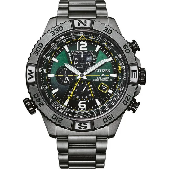 Erleben Sie das Zeitmanagement wie nie zuvor mit der Citizen® Chronograph 'Promaster Navihawk A-t' Herren Uhr AT8227-56X. Entworfen für den modernen Mann, der Präzision schätzt, sticht dieses von Piloten inspirierte Zeitmessgerät mit seinem auffälligen grünen Zifferblatt und dem robusten grauen Edelstahlgehäuse, das einen Durchmesser von 48 mm hat, hervor. Die Handwerkskunst ist in jedem Detail offensichtlich, von der runden Gehäuseform bis hin zu den leuchtenden Zeigern, die bei jeder Bedingung ablesbar sind. Diese Uhr ist nicht nur ein anspruchsvolles Accessoire, sondern auch ein verlässlicher Begleiter mit Eco-Drive-Technologie, die Licht nutzt und unendliche Energie bietet, während sie umweltfreundlich bleibt. Eine drehbare Lünette bringt zusätzliche Funktionalität und macht sie zu einem unverzichtbaren Werkzeug für Navigationsbegeisterte. Haltbar und zuverlässig ist die Citizen Promaster mit modernster Funksteuerung und einem Chronographen-Display ausgestattet. Ob Sie Ihr nächstes Abenteuer stoppen oder das Datum im Auge behalten, sie kombiniert mühelos Stil und Nutzen. Mit einer Wasserdichtigkeit von 20 bar hält sie verschiedenen Umgebungen stand, vom Meeresgrund bis zum Alltagsgebrauch. Eine Klappschließe sorgt für einen sicheren Sitz, während das 21 cm verstellbare Armband Komfort für jeden Anlass bietet. Umarmen Sie Luxus und Präzision mit einem Zeitmesser, der Abenteuer und Raffinesse symbolisiert, perfekt geeignet für den anspruchsvollen Mann. Shop Citizen® Chronograph 'Promaster Navihawk A-t' Herren Uhr bei Ormoda