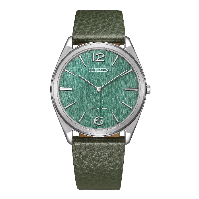 Citizen ist seit langem ein Synonym für Präzision und Handwerkskunst und hat sich als führendes Licht in der Welt der Uhrmacherei etabliert. Ihr Engagement für Innovation zeigt sich eindrucksvoll in dem Eco-Drive-Uhrwerk, das die Kraft des Lichts nutzt, um die Zeit zu halten und so die Notwendigkeit von Batteriewechseln eliminiert. Die Marke vereint nahtlos modernste Technologie mit zeitlosem Design und verspricht Uhren, die nicht nur Zeitmessinstrumente, sondern exquisite Stücke sind, die von Generation zu Generation weitergegeben werden sollen. Mit einem klaren Bekenntnis zu Nachhaltigkeit und Handwerkskunst verkörpert jede Citizen-Uhr, einschließlich der Suratto, eine Philosophie, die Zuverlässigkeit und Raffinesse kombiniert. Sie bedienen das Bedürfnis des modernen Mannes nach praktischer Funktionalität und einem Hauch von Eleganz, was sie zu perfekten Begleitern sowohl für den Alltag als auch für besondere Anlässe macht. Die Citizen® Analogue 'Suratto' Herren Uhr AR3120-32X ist eine atemberaubende Kombination aus Langlebigkeit und Raffinesse. Dieses bemerkenswerte Stück verfügt über ein 38 mm rundes Edelstahlgehäuse, das Stärke und eine polierte Ästhetik ausstrahlt. Das grüne Zifferblatt, das durch Saphirglas geschützt ist, hebt den einzigartigen Charakter der Uhr und die Lesbarkeit hervor. Die Eco-Drive-Technologie garantiert, dass diese Uhr durch jede Lichtquelle betrieben wird und Sie nie ohne Zeitmessung dastehen. Das elegante grüne Lederband ergänzt die Uhr wunderbar und misst 21 cm in der Länge und 20 mm in der Breite, gepaart mit einer klassischen Schnallenschließe für einen sicheren und komfortablen Sitz. Mit einer Dicke von nur 4,7 mm trägt sie sich angenehm am Handgelenk und ermöglicht eine langfristige Nutzung ohne Unbehagen. Diese Zeitmessung ist für kleine Abenteuer ausgelegt und mit bis zu 3 Bar Wasserdichtigkeit zertifiziert, sodass sie alltägliche Spritzer problemlos übersteht und ihr poliertes Aussehen behält. Mit nur 34 Gramm Gewicht ist die Citizen Suratto so leicht wie stilvoll und ideal für den anspruchsvollen Herren, der seine Sammlung mit einer Uhr bereichern möchte, die so vielseitig ist wie er selbst. Ob im Büro oder am Wochenende, sie wird Ihnen in jeder Umgebung gute Dienste leisten und dabei Stil und Leistung nicht opfern. Shop Citizen® Analogue 'Suratto' Herren Uhr bei Ormoda