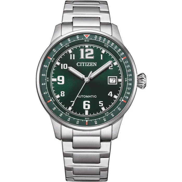 Die Citizen® Analogue 'Urban Military' Herrenarmbanduhr NJ0190-51X ist eine auffällige Darstellung moderner Eleganz, die mit robuster Funktionalität kombiniert wird. Entwickelt für den anspruchsvollen Mann, verfügt diese Uhr über ein automatisches Uhrwerk, das Präzision und Zuverlässigkeit bei jedem Tick gewährleistet. Das silberne Edelstahlgehäuse, mit einem Durchmesser von 40 mm und einer Dicke von 12 mm, bietet einen soliden, zugleich raffinierten Look, der sowohl kühn als auch sophisticated ist. Das grüne Zifferblatt bietet ein markantes Flair, während das Kristallglasfenster Sichtbarkeit und Haltbarkeit gegen die Elemente gewährleistet. Ein Datumsfunktion ergänzt die praktische Erscheinung dieser auffälligen Uhr. Mit einer Wasserdichtigkeit von bis zu 10 Atmosphären ist sie für Abenteuer geeignet, egal ob in städtischen Umgebungen oder bei Naturausflügen. Das silberne Edelstahlband, das eine Länge von 21 cm und eine Breite von 19 mm misst, ergänzt das Gehäuse perfekt und wird sicher mit einem Faltschließe mit Druckknopfverschluss befestigt. Die gesamte Höhe von 47 mm sorgt für einen angenehmen Sitz, wodurch sie ein idealer Begleiter für den täglichen Gebrauch oder besondere Anlässe ist. Dieses Zeitmessgerät ist nicht nur eine Uhr; es ist ein Ausdruck von Stil und Funktionalität, gestaltet für Männer, die Qualität und Design schätzen. Genießen Sie das Stadtleben mit militärisch inspiriertem Widerstand und Raffinesse und tragen Sie selbstbewusst eine Uhr, die für Detailverliebtheit und Eleganz steht. Shop Citizen® Analogue 'Urban Military' Herrenarmbanduhr NJ0190-51X bei Ormoda