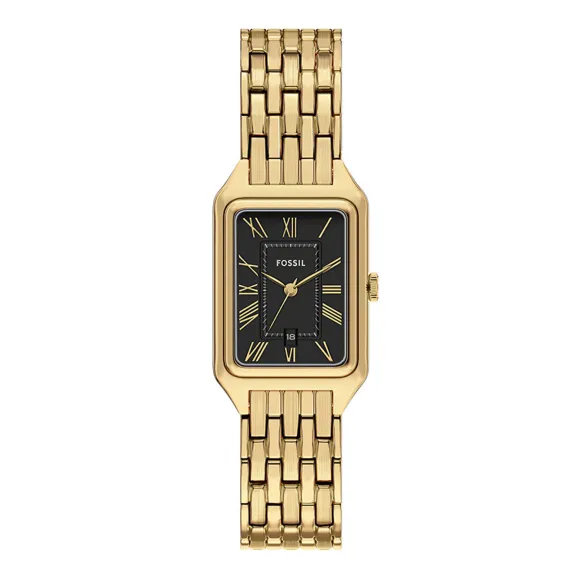 Entdecken Sie die Fossil® Analogue 'Raquel' Damen Uhr ES5434, eine fesselnde Kombination aus Raffinesse und zeitgemäßem Stil. Dieses exquisite Zeitmesser verfügt über ein rechteckiges Gehäuse aus strapazierfähigem Edelstahl, das mit einer strahlenden Goldoberfläche Eleganz ausstrahlt. Das schlanke Design misst 30 mm in der Länge und 23 mm in der Breite und behält mit nur 7 mm Dicke ein schlankes Profil. Das schwarze Zifferblatt, geschützt durch mineralisches Glas, bietet einen auffälligen Kontrast zum glänzenden Goldgehäuse und stellt sicher, dass die Uhrzeit mühelos ablesbar ist und in jeder Situation hervorsticht. Das luxuriöse Armband aus vergoldetem Edelstahl ergänzt das Gehäuse der Uhr perfekt und misst 19 cm in der Länge und 15 mm in der Breite, sodass es komfortabel am Handgelenk sitzt. Diese Ausführung verfügt über einen Klappverschluss mit Druckknopf für einen sicheren Halt, was sie sowohl funktional als auch modisch für den täglichen Gebrauch macht. Entworfen für die moderne Frau, bietet diese Uhr ein präzises Quarzwerk, das Ihnen ermöglicht, pünktlich und gleichzeitig atemberaubend auszusehen. Sie ist zudem bis zu 5 bar wasserdicht und gibt Ihnen die Gewissheit, dass sie den täglichen Aktivitäten standhält. Die Fossil® Analogue 'Raquel' Damen Uhr ist nicht nur ein Zeitmesser; sie ist ein stilvolles Accessoire, das Stil und Funktionalität nahtlos verbindet und somit die perfekte Ergänzung für jede Sammlung darstellt. Ein zeitloses Schmuckstück für all diejenigen, die das Besondere im Leben schätzen.Shop Fossil® Analogue 'Raquel' Damen Uhr bei Ormoda
