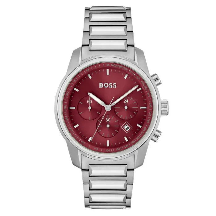 Die Hugo Boss® Chronograph 'Trace' Herren Uhr 1514004 ist die perfekte Wahl für den stilbewussten Mann, der Funktionalität und Design in einem sucht. Mit einem robusten Gehäuse aus Edelstahl in schimmerndem Silber und einem Durchmesser von 43 mm bietet dieses Modell sowohl Größe als auch Eleganz. Der runde Gehäusestil ergänzt das rote Zifferblatt, das durch Mineralglas geschützt ist, und sorgt für eine ansprechende visuelle Tiefe. Diese sportliche Uhr ist mit einem präzisen Quarz-Uhrwerk ausgestattet, das eine zuverlässige Zeitmessung garantiert. Dank des Chronographen-Displays und der Datumsanzeige sind Sie immer bestens informiert. Der Abstand zwischen den Hörnern beträgt 50 mm und die Dicke des Gehäuses ist mit 11 mm optimal für den täglichen Gebrauch. Das hochwertige Edelstahlarmband mit einer Länge von 21 cm und einer Breite von 21 mm sorgt für einen sicheren und komfortablen Sitz am Handgelenk. Der Klappverschluss mit Druckknopf ermöglicht ein schnelles An- und Ablegen, während die Wasserdichtigkeit bis zu 5 bar Ihnen die Freiheit gibt, die Uhr auch im Alltag ohne Bedenken zu tragen. Die Hugo Boss® Chronograph 'Trace' Herren Uhr ist nicht einfach nur ein Accessoire, sondern ein Statement, das Ihre Persönlichkeit unterstreicht. Ihr sportliches Design und die hochwertige Verarbeitung machen sie zur idealen Begleitung für jeden Anlass. Ob im Alltag oder zu besonderen Events, diese Uhr wird schnell zu Ihrem Lieblingsstück und wird Ihnen lange Freude bereiten.