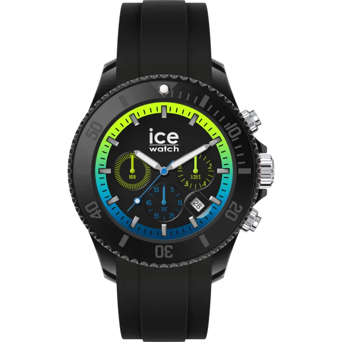 Die Ice Watch Chronograph 'Ice Chrono - Black Lime' ist eine bemerkenswerte Verbindung von Stil und Funktionalität, konzipiert für den modernen Mann mit einem aktiven Lebensstil. Mit einem auffälligen schwarzen Zifferblatt zieht diese Uhr mit ihrem markanten Chronographen-Display und dem unverwechselbaren sportlichen Flair die Aufmerksamkeit auf sich. Das Zeitmesser ist mit einem strapazierfähigen runden Gehäuse aus Kunststoffen ausgestattet, dessen Durchmesser von 48,5 mm eine kraftvolle Präsenz am Handgelenk bietet. Die drehbare Lünette erweitert seine Möglichkeiten und lädt ein, Runden zu messen oder die Zeit mühelos zu verfolgen. Entwickelt, um den Herausforderungen von Arbeit und Freizeit standzuhalten, überzeugt die Ice Chrono durch ihre Leistung mit einem Quarzwerk. Sie können sich auf ihre Präzision verlassen und genießen dabei die Freiheit eines 10-bar-Wasserdrucks, was sie für verschiedene Aktivitäten wie Schwimmen und Schnorcheln geeignet macht. Die Uhr ist mit einem stilvollen schwarzen Silikonband ausgestattet, das eine Länge von 21 cm und eine Breite von 23 mm hat, und sorgt so für Komfort und Stabilität beim Tragen. Der sichere Schnallenverschluss fügt eine weitere Schicht an Bequemlichkeit hinzu und ermöglicht es Ihnen, die Passform mühelos anzupassen. Besondere Merkmale wie der Datumsanzeiger heben die Funktionalität hervor. Das Zifferblatt aus Mineralglas ist so konzipiert, dass es kratzfest ist, während das elegante Schwarz-on-Schwarz-Farbthema sicherstellt, dass Sie es mühelos mit jedem Outfit kombinieren können. Mit einem Gewicht von nur 86 Gramm ist diese Uhr darauf ausgelegt, Sie den ganzen Tag zu begleiten, ohne unangenehm zu sein. Dieses Zeitmesser ist für diejenigen, die Qualität, Durchsetzungsvermögen und den Nervenkitzel von Abenteuern schätzen. Shop Ice Watch® Chronograph 'Ice Chrono - Black Lime' Herren Uhr (Extra Groß) 020616 bei Ormoda