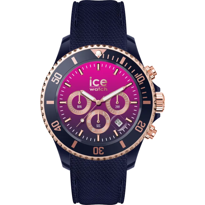 Die Ice Watch Chronograph 'Ice Chrono - Dark Blue Pink' Herrenuhr 021642 vereint sportliche Eleganz mit Funktionalität. Dieser Zeitmesser, entworfen für aktive Männer, überzeugt durch ein auffälliges Gehäuse aus blauem Resin, das sowohl stilvoll als auch langlebig ist. Mit einem Durchmesser von 40mm und einer Dicke von 13mm passt er perfekt an das Handgelenk jedes Mannes, der ein bequemes, aber dennoch raffiniertes Accessoire schätzt. Das markante blaue Zifferblatt zieht alle Blicke auf sich und bietet eine Chronographenanzeige, was sie zur idealen Wahl für sowohl lässige als auch formelle Anlässe macht. Seine mineralische Glaskuppel sorgt für Klarheit und Widerstandsfähigkeit gegen alltägliche Abnutzung, weshalb Sie sich viele Jahre auf diesen Zeitmesser verlassen können. Die Uhr verfügt über eine drehbare Lünette, die einen einzigartigen Touch verleiht und perfekt zum Timing von Ereignissen oder Aufgaben geeignet ist. In Kombination mit einem 19mm breiten Silikonarmband in passendem Blau, umschließt die Uhr bequem das Handgelenk und wird mit einer Schnallenverschlusssicherung für eine einfache Handhabung gesichert. Mit einer Länge von 21cm ist dieses Armband so gestaltet, dass es den meisten Handgelenkgrößen passt und eine vielseitige Ergänzung Ihrer Kollektion darstellt. Die Datumsfunktion bietet zusätzlichen Komfort, damit Sie die Zeit mühelos im Blick behalten können. Mit einer Wasserdichtigkeit von bis zu 10 bar können Sie sie ohne Bedenken bei Ihren aquatischen Abenteuern tragen. Shop Ice Watch® Chronograph 'Ice Chrono - Dark Blue Pink' Herrenuhr (Mittel) 021642 bei Ormoda