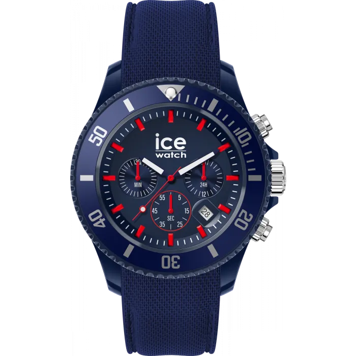 Die Ice Watch® Chronograph 'Ice Chrono - Dark Blue Red' Herren Uhr 020622 ist eine perfekte Kombination aus sportlichem Design und zuverlässiger Funktionalität, die sie zu einem Muss für Männer macht, die Leistung und Stil schätzen. Mit einem markanten 44-mm-Rundgehäuse aus Resin, ist dieses Zeitmessgerät nicht nur robust, sondern auch leicht, mit einem Gewicht von nur 60 Gramm. Die dunkelblaue Farbe des Gehäuses harmoniert hervorragend mit den lebhaften roten Akzenten auf der Lünette und dem Zifferblatt, was einen auffälligen Effekt erzeugt, der am Handgelenk sicher ins Auge fällt. Ausgestattet mit einem präzisen Quarzwerk sorgt diese Chronographen Uhr dafür, dass die Zeit akkurat bleibt, egal ob Sie gegen die Uhr antreten oder einfach nur ein Wochenende in der Natur genießen. Die drehbare Lünette ermöglicht es Ihnen, die vergangene Zeit leicht zu verfolgen, perfekt zum Messen von Trainingssessions oder Outdoor-Abenteuern. Das auffällige blaue Zifferblatt wird durch ein Mineralglas geschützt, das für Langlebigkeit sorgt und gleichzeitig unter verschiedenen Lichtverhältnissen eine klare Sicht gewährleistet. Die Uhr verfügt über eine Datumsanzeige, die Ihnen hilft, organisiert zu bleiben, und die Funktionalität des Stückes erweitert. Das 21 cm lange Silikonband ist bequem zu tragen und wird mit einer soliden Schnallenverschluss gesichert, was es ideal für aktive Lebensstile macht. Mit einer Wasserdichtigkeit von bis zu 10 Bar kann diese Uhr Spritzern und kurzer Nässe standhalten, sodass Sie sie in verschiedenen Umgebungen mit Zuversicht tragen können. Der Ice Chrono ist der ultimative Begleiter für diejenigen, die Stil und Praktikabilität in ihrem Handgelenk tragen wollen. Shop Ice Watch® Chronograph 'Ice Chrono - Dark Blue Red' Herren Uhr 020622 bei Ormoda