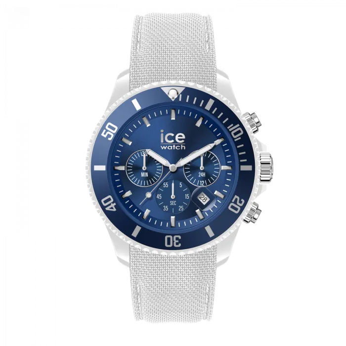 Die Ice Watch Chronograph 'Ice Chrono - White Blue' Herrenuhr (Large) 020624 ist ein dynamischer Ausdruck von Stil und Funktionalität, die für den aktiven Mann entworfen wurde. Mit einem markanten runden Gehäuse, das einen Durchmesser von 44 mm hat, strahlt diese Uhr eine robuste, aber zugleich verfeinerte Präsenz aus. Das lebendige blaue Zifferblatt wird durch Mineralglas geschützt, was für Klarheit und Widerstandsfähigkeit im täglichen Gebrauch sorgt. Die drehbare Lünette fügt eine Ebene der Vielseitigkeit hinzu und macht es zu einem Werkzeug für Ihre Abenteuer und nicht nur zu einem Zeitmesser. Mit einem sportlichen Stil, der Haltbarkeit und Eleganz kombiniert, ist dieses Zeitmesser perfekt für jene, die eine Uhr schätzen, die mit ihrem Lebensstil Schritt hält. Komfort hat oberste Priorität bei der Ice Chrono, dank des silikons weißen Armbands. Mit einer Länge von 21 cm und einer Breite von 21 mm ist es sowohl stabil als auch leicht und wiegt nur 60 Gramm. Die Schnallenverschluss sorgt für sicheren Halt zu jeder Gelegenheit, sei es auf dem Spielfeld oder bei einem lässigen Ausflug. Die Uhr ist zudem mit einer Kalenderfunktion ausgestattet, sodass Sie wichtige Daten mühelos im Blick behalten können. Mit einer Wasserdichtigkeit von bis zu 10 bar kann diese Sportuhr Spritzer und kurze Eintauchzeiten problemlos bewältigen, was Ihnen Sicherheit beim Erkunden der Natur verleiht. Das Quarzwerk sorgt für eine präzise Zeitmessung, und die benutzerfreundliche Funktionalität macht sie zu einem angenehmen Begleiter für jeden Mann. Mit der Ice Watch Chronograph erhalten Sie nicht nur eine Uhr, sondern einen zuverlässigen Partner für Ihre täglichen Abenteuer. Shop Ice Watch® Chronograph 'Ice Chrono - White Blue' Herrenuhr (Large) 020624 bei Ormoda