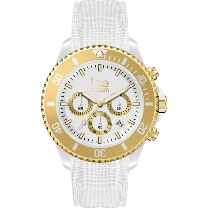 Die Ice Watch® Chronograph 'Ice Chrono - White Gold' 021595 vereint Stil und Funktionalität auf bemerkenswerte Weise und ist für die unisex Zielgruppe konzipiert. Mit ihrem sportlichen Design spricht diese Uhr aktive Menschen an, die sowohl Mode als auch praktische Eigenschaften schätzen. Die Uhr verfügt über ein auffälliges, weißes Gehäuse mit einem Durchmesser von 40mm, das aus strapazierfähigem Resin gefertigt ist, was sie leicht macht und gleichzeitig einen mutigen Auftritt ermöglicht. Die drehbare Lünette fügt ein Element der Interaktivität hinzu, das es den Benutzern erlaubt, mit ihrer Uhr auf einzigartige Weise zu interagieren. Das Chronographen-Display erhöht die Praktikabilität dieser Uhr und bietet mehrere Zeitmessfunktionen, ideal zum Stoppen von Workouts oder alltäglichen Aktivitäten. Das weiße Zifferblatt ist durch Mineralglas geschützt, das sowohl Klarheit als auch Kratzfestigkeit bietet. Das elegante weiße Silikonband ergänzt nicht nur die Uhr, sondern sorgt auch für Komfort und einen sicheren Sitz mit einem Schnallenverschluss, der einfache Anpassungen ermöglicht. Das Band misst 20cm in der Länge und passt sich mühelos einer Vielzahl von Handgelenkgrößen an. Mit einer Wasserdichtigkeit von bis zu 10 bar ist diese Uhr bereit, Sie auf jedes Abenteuer zu begleiten, sei es beim entspannten Ausgehen oder aktivem Einsatz. Mit einer Dicke von 13mm fühlt sie sich robust am Handgelenk an und bleibt dabei unauffällig. Darüber hinaus verfügt die Uhr über eine Datumsfunktion, die das aktuelle Datum prominent auf dem Zifferblatt anzeigt. Die Ice Watch® Chronograph 'Ice Chrono - White Gold' ist perfekt für alle, die eine Uhr suchen, die sportliches Aussehen mit unerlässlichen Zeitmessfähigkeiten verbindet, und damit ein ideales Accessoire für verschiedenste Anlässe. Shop Ice Watch® Chronograph 'Ice Chrono - White Gold' Unisex's Watch 021595 bei Ormoda
