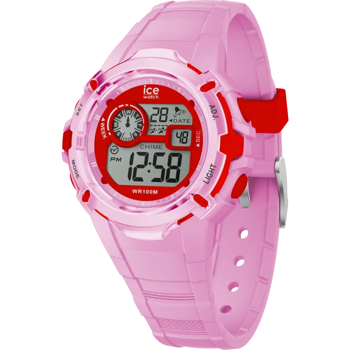 Die Ice Watch® Digital 'Ice Digit Explorer - Lovely Pink' Mädchenarmbanduhr verbindet auf wunderschöne Weise Funktionalität und verspielten Charme. Dieses Modell richtet sich an das lebhafte Herz junger Mädchen, die Abenteuer und Aufregung lieben. Mit ihrem auffälligen pinken Gehäuse und dem zarten roten Zifferblatt wird diese Uhr garantiert alle Blicke auf sich ziehen und jedes Outfit perfekt ergänzen. Sie misst 40 mm im Durchmesser und hat eine Dicke von 16 mm; das runde Gehäuse besteht aus strapazierfähigem Kunststoff, der sicherstellt, dass die Uhr dem aktiven Lebensstil ihrer Trägerin gerecht wird. Das hochwertige Mineralglas schützt das leuchtende Zifferblatt, das über ein benutzerfreundliches digitales Display verfügt, das sowohl gut lesbar als auch ästhetisch ansprechend ist. Mit nur 41 Gramm ist die Uhr leicht genug für den täglichen Gebrauch, während das 19 cm lange Silikonarmband einen bequemen Sitz verspricht, der sich schön an das Handgelenk anpasst. Was diese Uhr wirklich auszeichnet, sind ihre Funktionen. Ausgestattet mit einem Stoppuhr, einem Countdown-Timer, einer Dual-Zeitzonenfunktion, einem Alarm und sogar einem Licht für eine bessere Sichtbarkeit bei schwachem Licht, ist sie eine praktische Wahl für aktive Mädchen. Der Tagesdatumskalender sorgt dafür, dass wichtige Ereignisse nicht vergessen werden, was ihre Nützlichkeit erhöht. Mit einer Wasserdichtigkeitsbewertung von 10 bar kann diese Uhr ihre Trägerin problemlos zu Schwimmabenteuern und Outdoor-Aktivitäten begleiten. Für die jungen und freiheitsliebenden Herzen ist die Ice Digit Explorer mehr als nur eine Uhr; sie ist ein Stilstatement und ein Begleiter für alle, die viel unterwegs sind. Shop Ice Watch® Digital 'Ice Digit Explorer - Lovely Pink' Mädchenarmbanduhr (klein) 023268 bei Ormoda