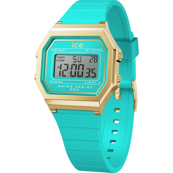Die Ice Watch® Digital 'Ice Digit Retro - Blue Curacao' Damenarmbanduhr 022055 ist eine genussvolle Verbindung von Stil und Funktionalität. Mit einem markanten blauen Ziffernblatt und einem eleganten Gehäuse aus goldfarbenem Harz verkörpert diese lässige Uhr perfekt den Geist zeitgenössischer Eleganz. Das Gehäuse hat eine Länge von 34 mm und eine Breite von 32 mm, sodass es wunderschön am Handgelenk sitzt und den ganzen Tag über einen bequemen Tragekomfort bietet. Die Uhr verfügt über ein Mineralglasfenster, das für Langlebigkeit sorgt und gleichzeitig das Display zum Strahlen bringt. Das fesselnde digitale Display bietet mehrere Funktionalitäten, darunter einen Kalender mit Tages- und Datumsanzeige, eine Stoppuhr, eine Dualzeit-Funktion und einen Alarm, was sie zu einem wertvollen Begleiter im hektischen Alltag moderner Frauen macht. Das blaue Silikonarmband, das 19 cm lang und 18 mm breit ist, ergänzt das Gesamtbild und verleiht einen Hauch von Spaß und Flexibilität. Mit einem Gewicht von nur 26 Gramm ist dieses Zeitmessgerät nicht nur leicht, sondern auch unglaublich stilvoll. Mit einer Wasserdichtigkeit von bis zu 3 Bar können Sie es in verschiedenen Umgebungen, von lässigen Ausflügen bis hin zu sportlichen Abenteuern, mit Zuversicht tragen. Erhellen Sie Ihre Momente mit der perfekten Mischung aus Eleganz und Innovation, die die Ice Digit Retro bietet, bereit, Ihre täglichen Erlebnisse unvergesslich zu machen. Shop Ice Watch® Digital 'Ice Digit Retro - Blue Curacao' Damenarmbanduhr 022055 bei Ormoda