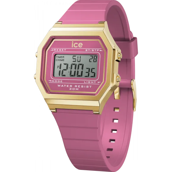 Verleihen Sie Ihrem Handgelenk mit der Ice Watch® Digital 'Ice Digit Retro - Blush Violet' Damenarmbanduhr 022051 einen Hauch von Farbe. Dieses trendige Zeitmesser zeichnet sich durch einen erfrischenden blush-violetten Farbton aus, der Wärme und Charme ausstrahlt und perfekt für die moderne Frau ist, die einen lässigen, aber dennoch einzigartigen Stil pflegt. Das rechteckige Gehäuse aus Resin in einem auffälligen Goldton misst 34 mm in der Länge und 32 mm in der Breite und macht es zu einem modischen Accessoire, das sich nahtlos in Ihre Alltagsbekleidung einfügt. Mit einem schlanken Profil von nur 8 mm bietet es einen bequemen Sitz, ohne auf Eleganz zu verzichten. Das pinkfarbene Zifferblatt wird elegant mit Mineralglas kombiniert, das sicherstellt, dass Ihre Uhr kratzfest bleibt und Ihnen einen klaren Blick auf die Zeit bietet. Die Digitalanzeige ist äußerst praktisch und verfügt über mehrere Funktionen, darunter Stoppuhr, Dualuhr, Alarm und Licht, die verschiedene Bedürfnisse im Laufe Ihres Tages erfüllen. Das Armband, das aus weichem Silikon besteht, passt bequem um Handgelenke mit bis zu 19 cm Umfang und hat eine Breite von 18 mm für einen sicheren Sitz. Mit einer Wasserdichtigkeit von 3 bar begleitet Sie diese Uhr auch bei leichtem Regen oder Spritzern, was sie zu einer hervorragenden Wahl für aktive Frauen macht. Der Schnallenverschluss gewährleistet eine bequeme Bedienung, während die Datumsanzeige Sie dabei unterstützt, Ihren Zeitplan im Blick zu behalten. Die Ice Digit Retro ist nicht nur eine Uhr; sie ist ein Ausdruck von Funktionalität und einem eleganten Design. Shop Ice Watch® Digital 'Ice Digit Retro - Blush Violet' Damenarmbanduhr bei Ormoda