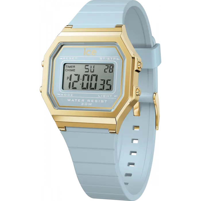Die Ice Watch® Digital 'Ice Digit Retro - Tranquil Blue' Damen Uhr 022058 vereint auf stilvolle Weise Funktionalität und Eleganz. Dieses lässige Zeitmesser strahlt mit seinem faszinierenden blauen Zifferblatt und dem passenden Silikonarmband eine beruhigende Gelassenheit aus. Das rechteckige Gehäuse aus strapazierfähigem Resin zeigt einen eleganten Goldton, der dem gesamten Design einen Hauch von Klasse verleiht. Mit einer Länge von 34 mm, einer Breite von 32 mm und einer Höhe von nur 8 mm bietet sie eine harmonische Mischung aus Kompaktheit und Eleganz. Die Uhr bietet eine Vielzahl praktischer Funktionen, darunter einen Tages-Datum-Kalender, eine Stoppuhr, eine duale Zeitanzeige, einen Alarm und sogar ein Licht für gute Sichtbarkeit bei schwachem Licht. Was diese Uhr besonders macht, ist ihr bemerkenswerter Quarzmechanismus, der Präzision in der Zeitmessung gewährleistet. Die digitale Anzeige ist nicht nur funktional, sondern auch modern, perfekt für die zeitgenössische Frau, die sowohl Stil als auch Nützlichkeit schätzt. Mit einem Gewicht von nur 26 Gramm sitzt sie angenehm am Handgelenk und wird durch ein verstellbares 19 cm Silikonarmband ergänzt, das auf Ihre persönlichen Vorlieben abgestimmt ist. Mit einer Wasserdichtigkeit von 3 BAR können Sie diese Uhr sorgenfrei tragen, während Sie alltäglichen Aktivitäten nachgehen, was sie zu einer vielseitigen Ergänzung Ihrer Accessoire-Kollektion macht. Ob beim Erledigen von Besorgungen, bei einem Meeting oder beim Ausgehen in den Abend, diese Uhr sorgt dafür, dass Sie immer schick und gut angezogen aussehen. Shop Ice Watch® Digital 'Ice Digit Retro - Tranquil Blue' Damen Uhr bei Ormoda
