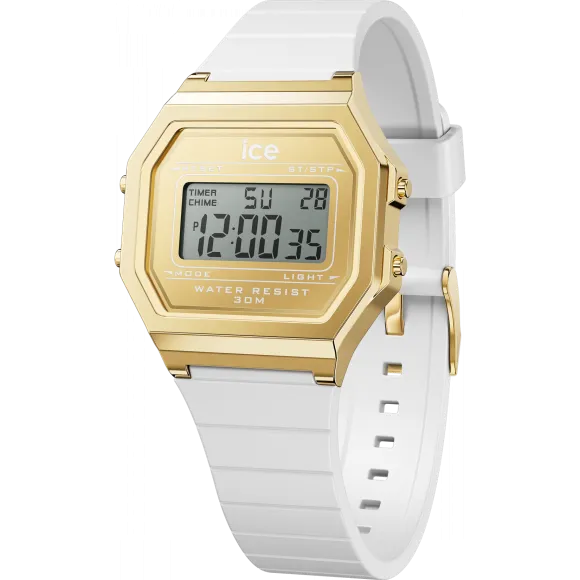 Die ikonische Ice Watch Marke hat Wellen in der Welt der Modeuhren geschlagen und ist bekannt für ihre verspielten Designs und lebendigen Farben. Diese Marke verkörpert einen Geist der Innovation, der Stil und Funktionalität verbindet, um Uhren anzubieten, die nicht nur die Zeit anzeigen, sondern auch ein Statement setzen. Ihre Kollektionen sind mit einem jugendlichen Flair gestaltet und sprechen modebewusste Menschen an, die sowohl Kreativität als auch Qualität schätzen. Jede Uhr ist mit einer einzigartigen Anziehungskraft gestaltet, die es den Trägern ermöglicht, ihre Persönlichkeit durch stilvolle Accessoires auszudrücken. Ice Watch betont die Vielseitigkeit und stellt sicher, dass jedes Stück für verschiedene Anlässe getragen werden kann, von legeren Ausflügen bis hin zu anspruchsvolleren Veranstaltungen. Das Engagement der Marke für langlebige Materialien und außergewöhnliche Handwerkskunst wird in jedem Detail deutlich, was eine Zuverlässigkeit liefert, die mit ihrer auffälligen Ästhetik übereinstimmt. Mit einer Vielzahl von Stilen und Designs ermöglicht Ice Watch jedem, das perfekte Stück zu finden, das mit seinem Modebewusstsein harmoniert. Die Ice Digit Retro - White Gold 022049, ist eine auffällige Damenarmbanduhr, die schicke Eleganz mit einem modernen Twist verkörpert. Die Uhr verfügt über ein atemberaubendes rechteckiges Gehäuse aus widerstandsfähigem Harz, das 34mm lang und 32mm breit ist. Ihr wunderschönes goldenes Zifferblatt ergänzt nahtlos die anspruchsvolle Ästhetik, während das Mineralglasfenster für Langlebigkeit und Klarheit sorgt. Die Uhr ist mit verschiedenen Funktionen ausgestattet, einschließlich eines Kalender mit Tages- und Datumsanzeige, Stoppuhr, Dual Time, Alarm und Licht, die der beeindruckenden Erscheinung Praktikabilität verleihen. Das leichte Design mit nur 26 Gramm macht sie bequem für den täglichen Gebrauch. Das schlanke weiße Silikonarmband, das eine Länge von 19 cm und eine Breite von 18 mm aufweist, sorgt für einen bequemen Sitz und hebt den overall schick aus. Mit einer Wasserdichtigkeit von 3 bar ist dieses Zeitmessgerät für den täglichen Gebrauch ausgelegt. Die Ice Digit Retro verbindet Mode und Funktionalität und ist das perfekte Accessoire für Frauen, die sowohl Lifestyle als auch Luxus umarmen möchten. Shop Ice Watch® Digital 'Ice Digit Retro - White Gold' Damen Uhr 022049 bei Ormoda