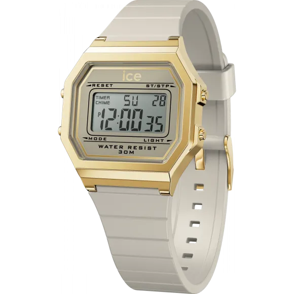 Tauchen Sie ein in eine Welt spielerischer Eleganz mit der Ice Watch® Digital 'Ice Digit Retro - Wind' Damenuhr. Diese lässige Zeitmessung, entworfen für moderne Frauen, erfasst das Wesen des Retro-Stils und integriert dabei wesentliche Funktionalität. Mit einer Länge und Breite von 34 mm präsentiert sich diese quadratische Uhr in einem schicken Gehäuse aus goldenem Resin, das durch ein elegantes graues Zifferblatt ergänzt wird und ein Gefühl von verfeinerter Glamour ausstrahlt. Die leichte Bauweise mit nur 25 Gramm sorgt für einen komfortablen Sitz im Alltag. Das strapazierfähige Mineralglas schützt das Display, während das Silikonarmband zusätzliche Flexibilität und Komfort bietet, wodurch es ein unverzichtbares Accessoire für alle Anlässe wird. An erster Stelle steht die Funktionalität dieser atemberaubenden Uhr, die über ein digitales Display verfügt, das nahtlos mit einer Vielzahl von Anwendungen integriert ist. Sie können Ihren Tag mühelos mit dem Datums- und Wochentagskalender organisieren, eine Stoppuhr für genaue Zeitmessungen nutzen, die Dual-Zeit-Einstellung perfekt für Reisen verwenden und sogar einen Alarm einrichten, um auf dem Laufenden zu bleiben. Die zusätzliche Lichtfunktion bietet praktische Vorteile in Situationen mit schlechten Lichtverhältnissen. Mit einer Wasserbeständigkeit von bis zu 3 bar ist sie für die Anforderungen des Alltags bestens gerüstet. Das Armband hat eine Länge von 19 cm und eine Breite von 17 mm und ist so konzipiert, dass es jeder Handgelenksgröße gerecht wird. Egal, ob Sie sich für einen Abend in Schale werfen oder tagsüber lässig bleiben, diese Uhr passt sich Ihrem Stil an. Die Ice Watch® Digital 'Ice Digit Retro - Wind' ist mehr als nur ein Zeitmesser; sie ist ein Markenzeichen, das Ihre einzigartige Persönlichkeit widerspiegelt. Verleihen Sie Ihrem Accessoire-Spiel den entscheidenden Schliff mit einem Zeitmesser, der Stil und Funktionalität perfekt ausbalanciert und somit eine ideale Ergänzung Ihrer Schmuckkollektion darstellt. Shop Ice Watch® Digital 'Ice Digit Retro - Wind' Damenuhr (Klein) 022066 bei Ormoda