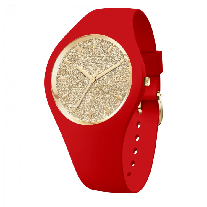Hier präsentieren wir die charmante Ice Watch® Analogue 'Ice Glitter - Red Passion' Damenarmbanduhr 021080, wo Eleganz auf lässigen Chic trifft. Diese Uhr ist für Frauen entworfen, die eine Kombination aus Funktionalität und Stil schätzen. Das lebendige rote Silikon-Gehäuse ist nicht nur auffällig, sondern auch leicht, was ein angenehmes Tragegefühl im Alltag garantiert. Mit einem Durchmesser von 40 mm und einer schlanken Dicke von 9 mm sitzt sie perfekt am Handgelenk und ermöglicht es Ihnen, Ihre einzigartige Persönlichkeit und Ihren Flair zur Schau zu stellen.\n\nDas Zifferblatt ist in einem atemberaubenden Gold gehalten, das mit einem Hauch von Glamour funkelt, und das Gesamtbild verstärkt. Das Armband aus strapazierfähigem Silikon in demselben strahlenden Rotton wird durch eine sichere Schnalle ergänzt, die das An- und Ablegen erleichtert. Mit einer Länge von 19 cm und einer Breite von 20 mm passt es bequem an verschiedene Handgelenkgrößen und sorgt für ganztägigen Tragekomfort ohne unangenehme Druckstellen.\n\nLanglebigkeit ist beim Ice Glitter Sortiment von größter Bedeutung. Dieses Modell hat eine Wasserdichtigkeit von bis zu 10 Bar, was bedeutet, dass es Spritzwasser und kurzes Eintauchen in Wasser standhalten kann, perfekt für Ihren aktiven Lebensstil. Das Mineralglas des Zifferblatts bietet eine zusätzliche Schutzschicht, die Klarheit und Widerstandsfähigkeit gegenüber alltäglichen Abnutzungen garantiert. Mit ihrem zuverlässigen Quarzwerk können Sie sich darauf verlassen, dass dieses Zeitmessgerät die Zeit perfekt hält und gleichzeitig einen Hauch von Farbe und Glanz zu Ihrem Outfit hinzufügt. Ob Sie sich für eine abendliche Verabredung herausputzen oder zu einem lässigen Mittagessen gehen, diese Uhr ist Ihr perfekter Begleiter. Shop Ice Watch® Analogue 'Ice Glitter - Red Passion' Damenarmbanduhr bei Ormoda