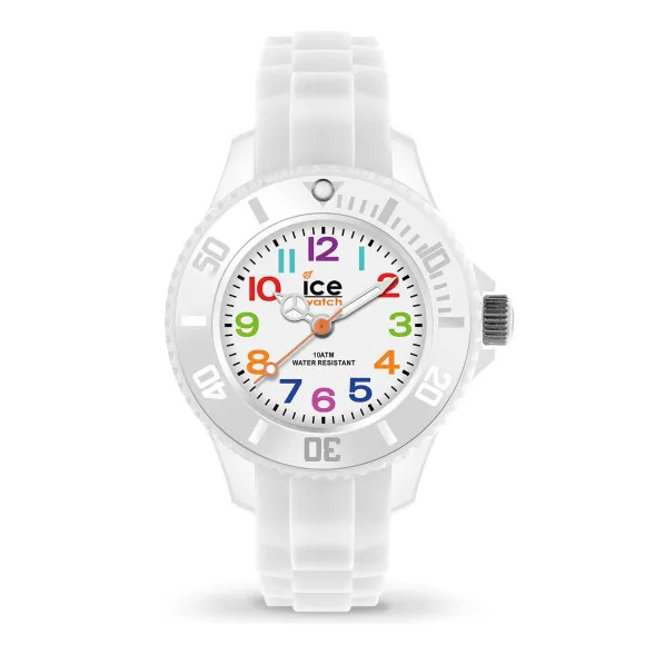 Die Ice Watch® Analogue 'Mini' Kinderuhr ist eine perfekte Kombination aus Stil und Funktionalität, die speziell für Kinder entwickelt wurde. Diese extra kleine Uhr verfügt über ein zierliches Gehäuse aus weißem Harz, das nicht nur leicht, sondern auch unglaublich langlebig ist. Mit einem Durchmesser von 28 mm und einer Dicke von 10 mm passt sie bequem an das Handgelenk eines Kindes. Die Uhr ist mit einer drehbaren Lünette ausgestattet, die eine spielerische Interaktion ermöglicht und gleichzeitig Kindern hilft, die Uhrzeit zu lernen. Das Zifferblatt ist ebenso charmant und in einem klaren Weiß gehalten, was die analoge Anzeige unterstreicht. Das Mineralglas schützt das Zifferblatt und sorgt dafür, dass die Uhr den Anforderungen eines aktiven Kinderspielalltags standhält. Das weiße Silikonband ist sowohl weich als auch flexibel, mit einer Länge von 19 cm und einer Breite von 12 mm, und sorgt für einen angenehmen Sitz, den Kinder zu schätzen wissen. Die Schnalle sorgt dafür, dass die Uhr sicher am Handgelenk bleibt, sodass Kinder ihre Abenteuer sorgenfrei genießen können. Mit einer Wasserdichtigkeit von 10 bar ist die Mini-Kinderuhr perfekt für das Paddeln in Pfützen oder das Händewaschen. Sie ist eine praktische Wahl für den täglichen Gebrauch. Mit einem Gewicht von nur 22 Gramm ist sie am Handgelenk eines Kindes kaum spürbar, was die Unabhängigkeit fördert, während sie lernen, ihre eigene Zeit zu verwalten. Insgesamt vereint die Ice Watch® Analogue 'Mini' Spaß, Funktionalität und Mode und ist ein unverzichtbares Accessoire für jeden jungen Trendsetter, der seine Individualität zum Ausdruck bringen und gleichzeitig pünktlich sein möchte. Shop Ice Watch® Analogue 'Mini' Kinderuhr (Extra Klein) 000744 bei Ormoda