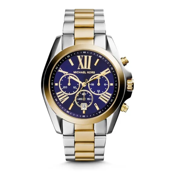 Einführung der bezaubernden Michael Kors® Chronograph 'Bradshaw' Damenarmbanduhr MK5976, ein exquisit gestaltetes Stück, das Eleganz und Raffinesse verkörpert. Diese atemberaubende Uhr ist für die moderne Frau konzipiert, die sowohl Stil als auch Funktionalität schätzt. Mit ihrem lebhaften Gehäuse aus mehrfarbigem Edelstahl ist diese Uhr nicht nur ein Mode-Statement, sondern auch ein vielseitiges Accessoire, das eine Vielzahl von Outfits, von lässig bis formell, ergänzen kann. Das runde Gehäuse hat einen Durchmesser von 42 mm und eine Dicke von 12 mm und beherbergt ein auffälliges blaues Zifferblatt, das dem gesamten Design einen Hauch von Charme verleiht. Das Mineralglas schützt das schimmernde Zifferblatt und ermöglicht unter allen Umständen eine einfache Zeitanzeige. Die Uhr verfügt über ein Chronographen-Display und erfüllt die Anforderungen von Personen, die Präzision und Praktikabilität in ihrem täglichen Leben schätzen. Das wunderschön gestaltete mehrfarbige Armband, das 19 cm lang und 20 mm breit ist, wird mit einer Klappschließe mit Druckknopfmechanismus gesichert, was sowohl Komfort als auch einen sicheren Sitz gewährleistet.