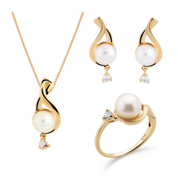 Orphelia® 'Adia' Damen Sterling Silber Set: Halskette + Ohrringe + Ring ist eine faszinierende Kollektion, die Eleganz und Raffinesse verkörpert. Dieses exquisite Set umfasst eine atemberaubende Halskette, die den Hals anmutig umschmeichelt, mit einer Länge, die leicht für die perfekte Passform angepasst werden kann. Ihr luxuriöser Goldton ergänzt wunderschön die strahlenden, aus frischem Wasser kultivierten Perlen und die brillanten Zirkonsteine, wodurch der Reiz des Sets verstärkt wird. Die Halskette verfügt außerdem über einen eleganten Karabinerhakenverschluss, der sowohl eine einfache Handhabung als auch Sicherheit bietet. Die passenden Ohrringe sind ebenso fesselnd und zeigen ein Design, das aufgrund seiner kunstvollen Schönheit Aufmerksamkeit erregt. Mit runden, weißen, aus frischem Wasser kultivierten Perlen geschmückt, verfügen diese Ohrringe über einen Schmetterlingsverschluss, der einen sicheren und komfortablen Sitz bietet. Dadurch können Sie sie mühelos von Tag zu Nacht tragen. Jedes Stück in diesem Set wird mit akribischer Liebe zum Detail aus hochwertigem 925 Sterling Silber gefertigt, um langlebige Qualität und Glanz zu gewährleisten. Abgerundet wird die Kollektion durch einen atemberaubenden Ring, der die Eleganz der Halskette und der Ohrringe widerspiegelt. Mit einer reizvollen runden Perle versehen, verleiht dieses Schmuckstück jedem Outfit einen Hauch von Raffinesse und eignet sich sowohl für legere Anlässe als auch für formelle Gelegenheiten. Mit einem Gesamtgewicht von 8,60 Gramm ist das Orphelia® 'Adia' Set leicht, aber eindrucksvoll, und damit ein unverzichtbarer Bestandteil jeder Schmucksammlung einer Frau. Ob für sich selbst oder als Geschenk erworben, dieses elegante Set wird sicher über Jahre hinweg geschätzt werden.Shop Orphelia® 'Adia' Damen Sterling Silber Set: Halskette + Ohrringe + Ring - Gold SET-7473 bei Ormoda