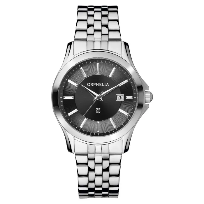 Präsentation der Orphelia® Analogue 'Galaxy' Herren Uhr 153-7709-48, wo Eleganz auf Funktionalität trifft. Dieses exquisite Zeitmesser ist für den modernen Gentleman konzipiert und kombiniert einen klassischen Dresswatch-Stil mit zeitgemäßen Merkmalen. Die Uhr verfügt über ein Edelstahlgehäuse mit einem Durchmesser von 39 mm und einer schlanken Dicke von 9 mm, was ein elegantes Profil an Ihrem Handgelenk gewährleistet. Ihr rundes Gehäuse wird durch ein auffälliges graues Zifferblatt ergänzt, das durch robustes Mineralglas geschützt ist und eine klare Ansicht der Uhrzeit und des Datums bietet. Die Uhr ist mit einem zuverlässigen Quarzwerk ausgestattet, das Präzision und Zuverlässigkeit für jede Gelegenheit garantiert. Das Edelstahlband, das bis zu 21 cm reicht, strahlt in einem polierten silbernen Farbton, der die Gesamt-Eleganz der Uhr betont, während es gleichzeitig robust genug für den alltäglichen Gebrauch ist. Mit einer Breite von 20 mm bietet das Band eine bequeme Passform, die mit einer Faltschließe mit doppeltem Druckknopf-Sicherheitsmechanismus gesichert ist. Dies erhöht nicht nur die Sicherheit der Uhr, sondern sorgt auch für eine einfache Handhabung. Die Galaxy-Uhr ist dafür ausgelegt, den Strapazen des täglichen Lebens standzuhalten und ist bis zu 10 bar wasserdicht, wodurch sie sowohl für formelle Anlässe als auch für lockere Ausflüge geeignet ist. Ihr anspruchsvolles, aber robustes Design macht dieses Zeitmesser zu einer perfekten Wahl für Männer, die Stil schätzen, ohne auf Langlebigkeit verzichten zu müssen. Setzen Sie neue Maßstäbe in Ihrer Accessoire-Auswahl mit der Orphelia Galaxy, der Quintessenz einer Uhr für den anspruchsvollen Gentleman. Shop Orphelia® Analogue 'Galaxy' Herren Uhr 153-7709-48 bei Ormoda