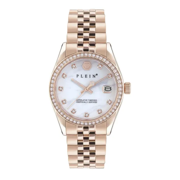 Die Philipp Plein® Analogue 'Date Superlative' Damen Uhr PWYAA0623 ist eine atemberaubende Kombination aus Eleganz und Raffinesse. Dieses exquisite Zeitmessgerät präsentiert ein wunderschönes rundes Gehäuse aus hochwertigem Edelstahl, versehen mit einem strahlenden Roségold-Ton, der das luxuriöse Design perfekt ergänzt. Mit einem Durchmesser von 34mm und einer Dicke von 10mm ist sie ideal für die anspruchsvolle Frau, die sowohl Stil als auch Komfort schätzt. Das Zifferblatt der Uhr zeigt ein fesselndes Zifferblatt aus Perlmutt, das elegant mit Steinsetzungen verziert ist und bei jeder Bewegung funkelt. Ein wahrhaftiges Statement-Stück, das nicht nur Ihr Outfit bereichert, sondern auch den italienischen Flair verkörpert, der synonymous mit Philipp Plein ist. Das robuste Mineralglas schützt das Zifferblatt und sorgt dafür, dass die Schönheit dieser Uhr über die Zeit hinweg besteht. Mit einem präzisen Quarzwerk können Sie sich darauf verlassen, dass Ihre Zeit stets genau angezeigt wird. Das Armband, ebenfalls aus Roségold-Edelstahl, misst 19cm in der Länge und 17mm in der Breite und ist mit einer sicheren Deployment-Schließe ausgestattet, um zusätzlichen Schutz zu bieten. Ausgestattet mit einer Datumsanzeige und einer beeindruckenden Wasserdichtigkeit von bis zu 5 bar, vereint diese Uhr Praktikabilität mit Stil. Die Philipp Plein® Analogue 'Date Superlative' Damen Uhr ist das ultimative Accessoire für jede Gelegenheit und hebt Ihr Aussehen mühelos auf eine neue Ebene. Shop Philipp Plein® Analogue 'Date Superlative' Damen Uhr PWYAA0623 bei Ormoda