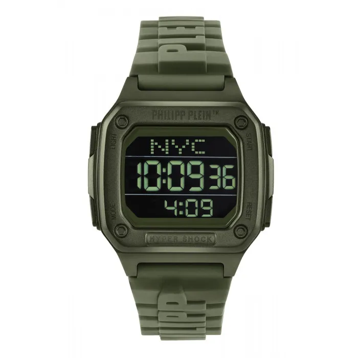 Wir präsentieren die Philipp Plein® Digital 'Hyper $hock' Herren Uhr PWHAA0421, ein bemerkenswertes Zeitmessgerät, das sportlichen Stil mit modernster Technologie verbindet. Diese Uhr ist für den modernen Mann entworfen, der sowohl Funktionalität als auch Fashion schätzt. Mit einem auffälligen rechteckigen Gehäuse aus Edelstahl zieht die tiefgrüne Farbe alle Blicke auf sich und ergänzt jedes Outfit in beeindruckender Weise. Mit einer Länge von 44 mm und einer Breite von 40 mm sorgt sie für Aufmerksamkeit und verspricht dabei eine langlebige Nutzung. Die Dicke von 12 mm bietet einen robusten Rahmen, der den Anforderungen eines aktiven Lebensstils standhält. Das Zifferblatt in stilvollem Schwarz ist durch Mineralglas geschützt, um Kratzer zu widerstehen und gleichzeitig für klare Sicht zu sorgen. Ausgestattet mit einem digitalen Display bietet die Uhr zahlreiche Annehmlichkeiten wie Stoppuhr, Timer, Alarm und Licht, was sie ideal für Sportbegeisterte oder jeden macht, der Pünktlichkeit in seinem geschäftigen Leben schätzt. Die Datumsanzeige ist ein zusätzlicher Vorteil, der Ihnen hilft, Ihr Zeitmanagement mühelos zu organisieren. Die Hyper $hock ist nicht nur funktional, sondern auch bequem. Mit einem 21 cm langen Silikonband, das sanft am Handgelenk anliegt, hat es eine Breite von 22 mm und wird durch eine strapazierfähige Schnalle gesichert. Das grüne Band ergänzt das Gehäuse der Uhr und schafft einen stilvollen, harmonischen Look, der garantiert auffällt. Mit einer beeindruckenden Wasserdichtigkeit von 5 bar ist diese Uhr bereit für jedes Abenteuer, sei es im Fitnessstudio oder bei einem Tag am Wasser. Entworfen für diejenigen, die beste Qualität fordern, verkörpert die Hyper $hock wirklich die perfekte Verbindung von Sportlichkeit und Raffinesse. Shop Philipp Plein® Digital 'Hyper $hock' Herren Uhr bei Ormoda