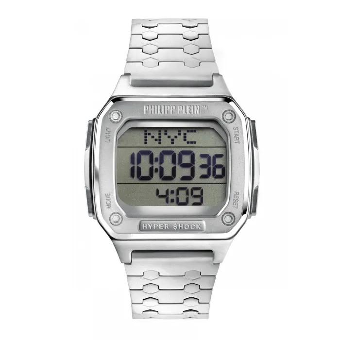 Die Philipp Plein® Digital 'Hyper $hock' Unisex-Uhr PWHAA0521 ist ein Ausstellungsstück, das gekonnt Stil und Funktionalität verbindet. Diese Sportuhr ist für die dynamische Persönlichkeit konzipiert und präsentiert ein zeitgemäßes, rechteckiges Gehäuse aus leichtem, aber robustem Edelstahl. Mit einer Länge von 44mm und einer Dicke von 12mm hat sie eine beeindruckende Präsenz am Handgelenk und bleibt dennoch bequem für den täglichen Gebrauch. Das auffällige silberne Gehäuse und Armband erfüllt die Ansprüche sowohl von Trendsettern als auch von klassischen Eleganzliebhabern. Das Zifferblatt mit LCD-Anzeige ist sowohl leicht ablesbar als auch visuell ansprechend. Geschützt durch ein strapazierfähiges Mineralglas, bietet das Zifferblatt fortschrittliche Funktionen wie Stoppuhr, Timer und Alarm, sodass Sie immer auf dem richtigen Weg sind. Der digitale Anzeigetyp verstärkt die moderne Ästhetik und sorgt für präzise Zeitmessung. Mit einer Wasserdichtigkeit von bis zu 5 Bar ist diese Uhr für verschiedene Aktivitäten geeignet, von Trainingseinheiten bis zu lässigen Ausflügen. Für alle Handgelenke geeignet, misst das Edelstahlarmband 20cm in der Länge und 22mm in der Breite, wobei es mit einer Druckknopf-Faltschließe gesichert ist, um die Handhabung zu erleichtern. Die elegante Verbindung von Leistung und Stil ist perfekt für jeden, der ein Statement setzen möchte, ohne dabei auf Funktionalität verzichten zu müssen. Die zusätzliche Datumsanzeige macht sie zu einem unverzichtbaren Accessoire für Ihren Alltag. Wählen Sie dieses einzigartige Zeitmessgerät, um Ihr Alltagsoutfit zu verbessern und die Fusion von Sport und Luxus zu erleben, für die Philipp Plein bekannt ist. Shop Philipp Plein® Digital 'Hyper $hock' Unisex-Uhr bei Ormoda