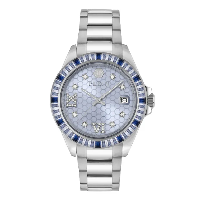 Die Philipp Plein® Analogue 'Ladyempire' Damenuhr PW2FA0125 ist eine meisterhafte Kombination aus Eleganz und Raffinesse, die speziell für die moderne Frau entworfen wurde. Diese exquisite Uhr präsentiert ein atemberaubendes blauen Zifferblatt, das perfekt durch die funkelnden Steineinfassungen auf der Lünette akzentuiert wird. Sie strahlt Luxus mit jedem Blick aus. Hergestellt aus einem hochwertigen Edelstahlgehäuse, vereint sie Langlebigkeit und atemberaubende Ästhetik und hat einen Durchmesser von 39mm sowie eine Dicke von nur 11mm, was sie perfekt für jedes Handgelenk macht. Die Uhr verfügt über ein präzises Quarzwerk, das für eine genaue Zeitmessung sorgt und durch das analoge Display zusätzlich verbessert wird. Eine Datumsfunktion ist nahtlos integriert, sodass Sie nicht nur die Uhrzeit im Blick haben, sondern auch wichtige Termine und besondere Anlässe festhalten können. Das Zifferblatt aus Mineralglas bietet eine hervorragende Sichtbarkeit und schützt gleichzeitig vor Kratzern und Beschädigungen. Die silberne Farbgebung des Gehäuses und des Armbands harmoniert wunderschön mit dem blauen Zifferblatt und schafft einen charmanten Kontrast, der alle Blicke auf sich zieht. Mit einer Armbandlänge von 19cm und einer Breite von 20mm bietet sie einen komfortablen Sitz und lässt sich mit einem Sicherheitsverschluss anbringen. Dieses luxuriöse Stück ist mit 5 ATM bewertet, sodass es den täglichen Aktivitäten ohne Sorgen standhält. Mit der Philipp Plein® Analogue 'Ladyempire' Uhr tragen Sie nicht nur eine Uhr; Sie setzen ein Statement, das viel über Ihren exquisiten Geschmack in der Mode aussagt.