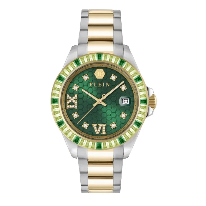 Die Philipp Plein® Analogue 'Ladyempire' Damenarmbanduhr symbolisiert die perfekte Mischung aus Eleganz und Kühnheit. Entworfen für die moderne Frau, verkörpert dieses exquisite Zeitmessgerät alles, was das Ethos von Philipp Plein ausmacht: schicke Raffinesse gepaart mit gewagter Boldness. Im Herzen der Ladyempire befindet sich ein präzises Quarzwerk, das für eine einwandfreie Zeitanzeige bei jedem Tick sorgt. Das 39 mm große, runde Gehäuse aus Edelstahl ist mit einer funkelnden Lünette verziert, die atemberaubende Steineinstellungen aufweist, was es nicht nur zu einer Uhr, sondern zu einem markanten Accessoire macht. Das mehrfarbige Gehäuse und das Armband spiegeln eine lebendige Persönlichkeit wider, perfekt für spontane Ausflüge und formelle Anlässe. Das fesselnde grüne Zifferblatt, geschützt durch Mineralglas, bietet eine klassische analoge Anzeige, die mit einer Datumsfunktion ausgestattet ist, damit Sie organisiert bleiben, ohne den Stil zu opfern. Die mehrfarbige Edelstahluhr mit einem Deployment-Verschluss weist eine Länge von 19 cm und eine Breite von 20 mm auf, was Langlebigkeit und Komfort am Handgelenk garantiert. Mit einer Wasserbeständigkeit von bis zu 5 bar ist die Ladyempire Uhr bereit, sie auf all Ihren Abenteuern zu begleiten und ist somit eine vielseitige Ergänzung Ihrer Schmuckkollektion. Wählen Sie dieses Zeitmessgerät und umarmen Sie den schick, aber verspielten Geist, den es verkörpert. Shop Philipp Plein® Analogue 'Ladyempire' Damenarmbanduhr PW2FA0225 bei Ormoda