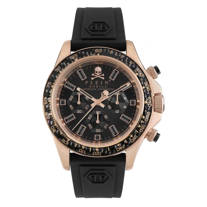 Erleben Sie den faszinierenden Charme der Philipp Plein® Chronograph 'Nobile Racing' Herrenuhr PWVAA0623, einem beeindruckenden Accessoire, das Macht und Stil verkörpert. Diese lässige Uhr besticht durch ein markantes schwarzes Zifferblatt und ein lebhaftes Gehäuse aus rosévergoldetem Edelstahl. Der Durchmesser des Gehäuses von 43 mm sorgt für eine selbstbewusste Präsenz am Handgelenk und verleiht zugleich eine Eleganz, die kaum zu übersehen ist. Ein Mineralglas schützt das Zifferblatt und gewährleistet Langlebigkeit sowohl im Alltag als auch bei besonderen Anlässen. Die Dicke von 12 mm spricht für die robuste Natur der Uhr, während die Tachymeterlünette ihren sportlichen Reiz verstärkt und sie ideal für Leistungsenthusiasten macht. Das komfortable, schwarze Silikonband sorgt für einen sicheren Sitz und hat eine Länge von 21 cm bei einer Breite von 21 mm. Der Ratschenverschluss ermöglicht ein einfaches Anlegen, sodass Sie mühelos von lässigen Ausflügen zu formelleren Anlässen wechseln können. Das Chronographen-Display bietet einen funktionalen Vorteil, perfekt zum präzisen Zeitmanagement. Diese Uhr ist konzipiert, um den Herausforderungen des Alltags standzuhalten, und bietet eine Wasserdichtigkeit von bis zu 5 bar. Sie ist nicht nur ein Accessoire, sondern auch ein Statement, das den kühnen Geist des modernen Mannes widerspiegelt.
