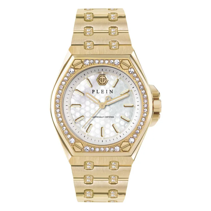 Entdecken Sie die exquisite Philipp Plein® Analogue 'Plein Extreme' Damen Uhr PWJAA1223, ein atemberaubendes Zeitmessgerät, das Eleganz und Raffinesse nahtlos miteinander verbindet. Diese glamouröse Uhr wurde für die moderne Frau entworfen und ist nicht nur ein Werkzeug zur Zeitmessung, sondern ein Statement für Stil und Individualität. Das strahlende Zifferblatt aus Perlmutt wird von einem luxuriösen, vergoldeten Edelstahlgehäuse umrahmt, das wunderschön durch die kunstvollen Steinbesetzungen der Lünette ergänzt wird und einen fesselnden Reiz verleiht. Das runde Gehäuse hat einen Durchmesser von 38 mm und eine verfeinerte Dicke von 10 mm, was es zu einem idealen Accessoire für Alltag und Abendgarderobe macht. Die Uhr ist mit einem Quarzwerk ausgestattet, das präzise Zeitmessung gewährleistet und gleichzeitig eine mühelose Anziehungskraft ausstrahlt. Das passende Armband aus goldfarbenem Edelstahl misst eine Länge von 19 cm und eine Breite von 22 mm und bietet durch den gut gestalteten Einschiebeverschluss einen bequemen und sicheren Sitz. Mit einer Wasserbeständigkeit von bis zu 5 bar ist diese Uhr ebenso funktional wie modisch und ermöglicht es Ihnen, sie mit Vertrauen in verschiedenen Umgebungen zu tragen. Ihre Höhe von 45 mm vom Anschlag zu Anschlag sorgt für eine schmeichelhafte und elegante Silhouette am Handgelenk, die sich perfekt für jede Gelegenheit eignet. Erhöhen Sie Ihre Accessoire-Kollektion mit diesem luxuriösen Zeitmesser, der sowohl Stil als auch Praktikabilität bietet. Ob Sie sich für ein elegantes Ereignis herausputzen oder Ihrem Alltagslook einen Hauch von Klasse verleihen möchten, die Philipp Plein® 'Plein Extreme' Uhr ist die perfekte Wahl für die anspruchsvolle Frau, die Qualität und ästhetische Anziehung wertschätzt. Zeigen Sie Ihren einzigartigen Geschmack mit einer Uhr, die Ihre Persönlichkeit und Ihren Stil widerspiegelt. Shop Philipp Plein® Analogue 'Plein Extreme' Damen Uhr bei Ormoda