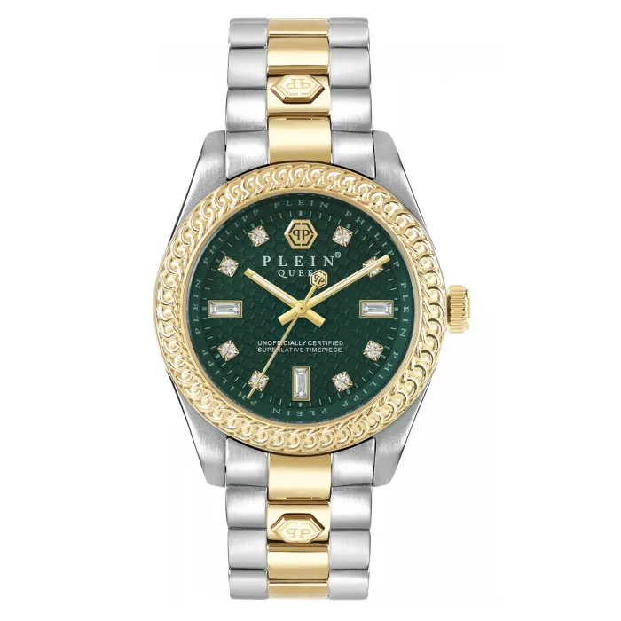 Die Philipp Plein® Analoge 'Queen' Damen Uhr PWDAA0421 ist eine atemberaubende Verkörperung von Eleganz und Raffinesse, die für die moderne Frau kreiert wurde, die Luxus zu schätzen weiß. Dieses exquisite Zeitwerk wird durch ihr wunderschönes grünes Zifferblatt definiert, das ein Gefühl von Selbstbewusstsein und Unterscheidung vermittelt. Eingekapselt in einem robusten Gehäuse aus vergoldetem Edelstahl, das einen Durchmesser von 36 mm und eine Dicke von 12 mm aufweist, zeigt sie eine runde Silhouette, die jeden Kleidungsstil mühelos ergänzt. Das Mineralglas schützt die Uhr und ermöglicht es den lebhaften Tönen des Zifferblatts, durchzuleuchten. Das mehrfarbige Armband aus Edelstahl, mit einer komfortablen Länge von 19 cm und einer Breite von 18 mm, verbessert das Gesamtbild und sorgt dafür, dass diese Uhr das perfekte Accessoire für sowohl lässige als auch formelle Anlässe ist. Angetrieben von einem präzisen Quarzwerk garantiert sie eine zuverlässige Zeitmessung für die Trägerin. Das Armband verfügt über eine Deployment-Schließe, die einen sicheren Sitz gewährleistet und zur luxuriösen Ausstrahlung der Uhr beiträgt. Mit einer Wasserdichtigkeit von 5 ATM ist diese Uhr sowohl modisch als auch funktional, was sie für den täglichen Gebrauch geeignet macht. Die beeindruckende Höhe von 44 mm zwischen den Hörnern schafft eine ausgewogene Optik, die die Eleganz des Handgelenks unterstreicht. Die Marke Philipp Plein ist seit jeher Synonym für Opulenz, und dieses Zeitstück ist keine Ausnahme; es strahlt Stil, Charme und Selbstbewusstsein aus und setzt mit jedem Tragen ein markantes Statement. Shop Philipp Plein® Analoge 'Queen' Damen Uhr bei Ormoda